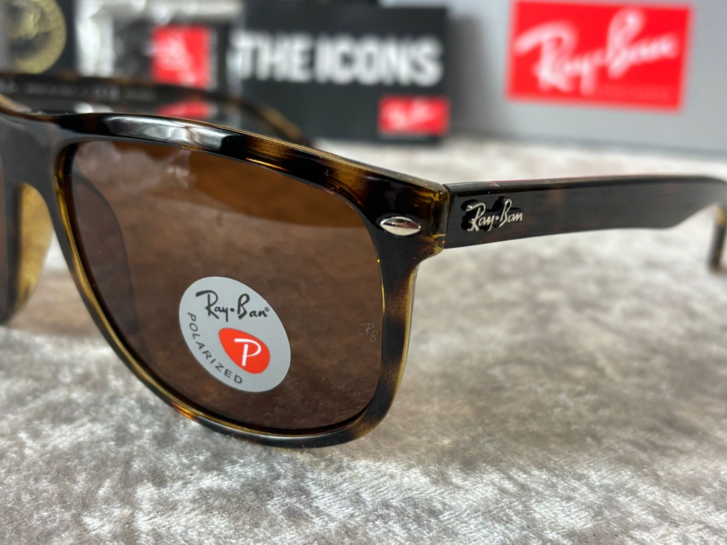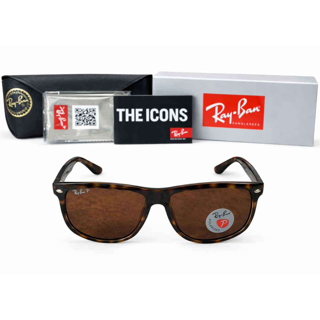 Crafted from durable acetate, the frame provides a comfortable yet solid feel on the wrist, while the brown polarised lenses deliver enhanced clarity and effective glare reduction in bright conditions. The gently curved design ensures a secure and flattering fit, complemented by subtle Ray-Ban branding to the temples and lenses.