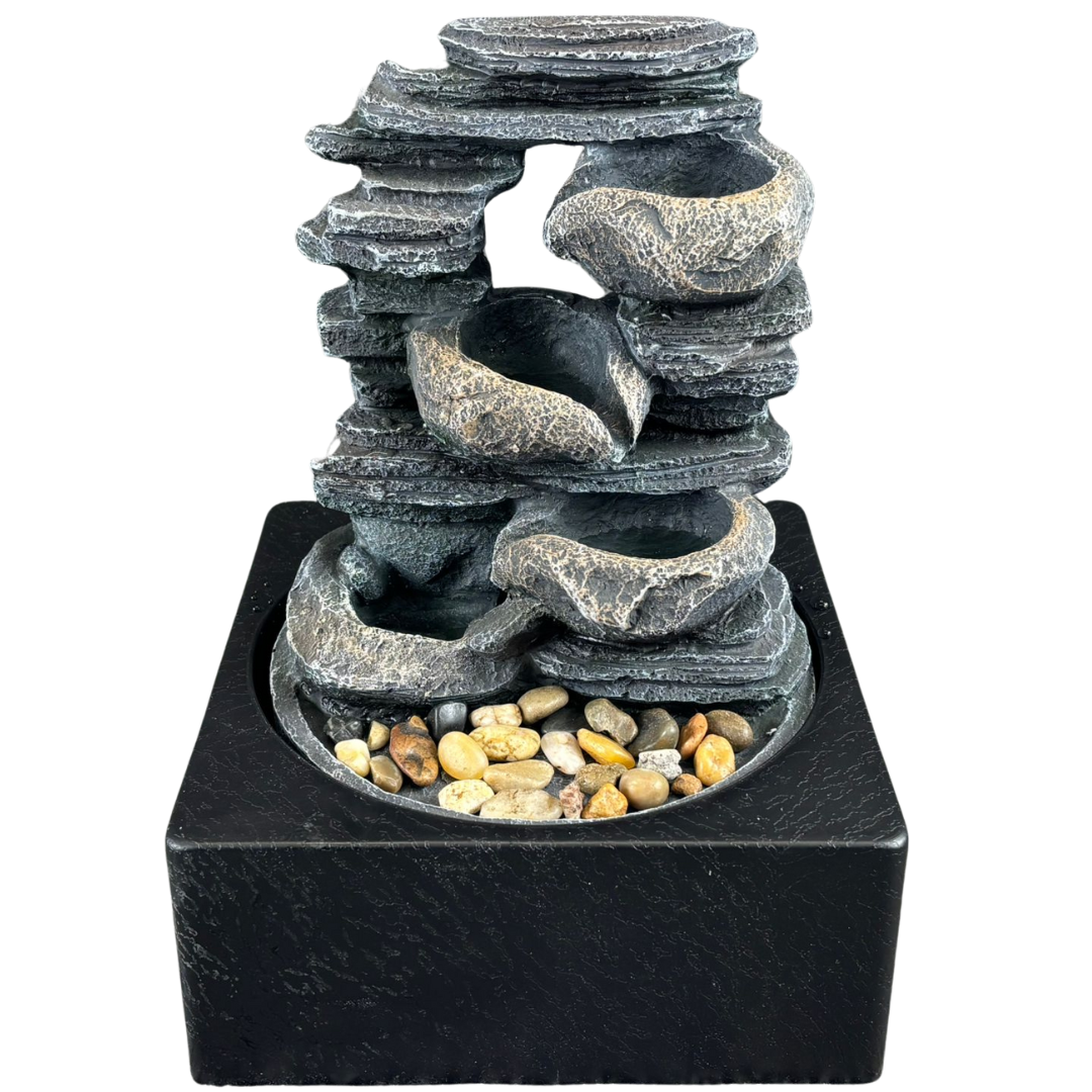 A Riverstone Falls Water Fountain, a striking piece inspired by the rugged textures of natural rock formations. Designed with multiple tiers, water flows gently through carved stone-effect bowls, creating a soothing cascade that adds both sound and movement to your space. Decorative pebbles at the base complete the natural look, enhancing its charm and authenticity.