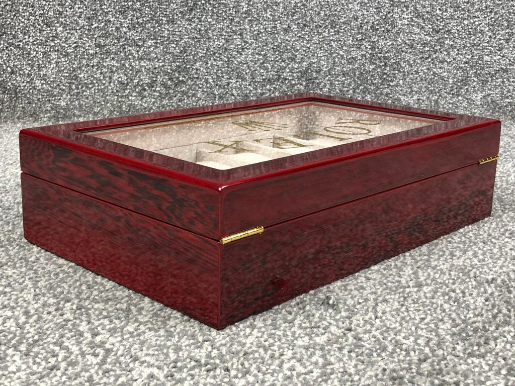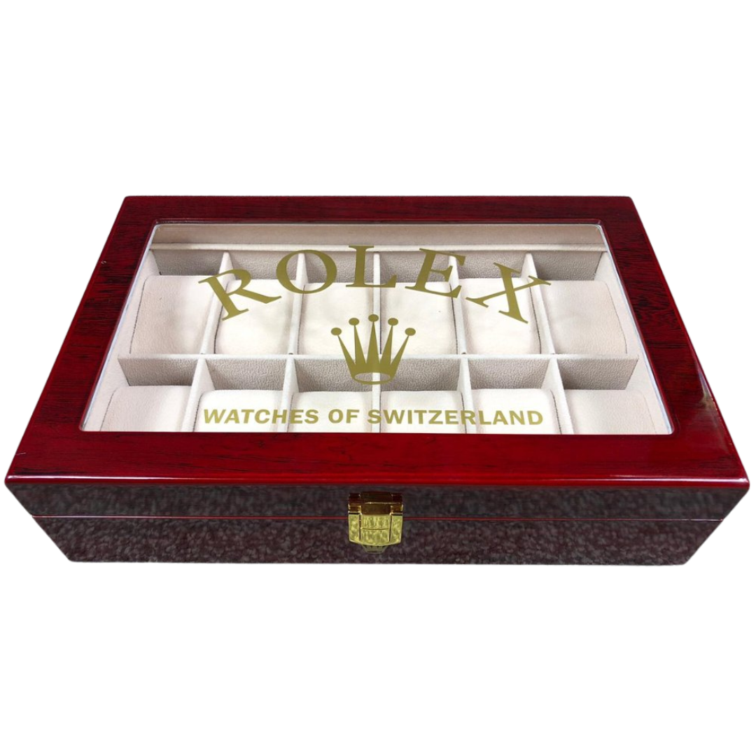 A Rolex 12 compartment open top watch box with cream interior, designed to showcase and protect a distinguished collection in true luxury style. Finished in a rich red-toned wood exterior, this presentation box offers a refined and professional display solution for any serious collector. The clear viewing panel to the lid features the iconic Rolex crown and branding, making it a striking addition to any dressing room, office or secure display setting.