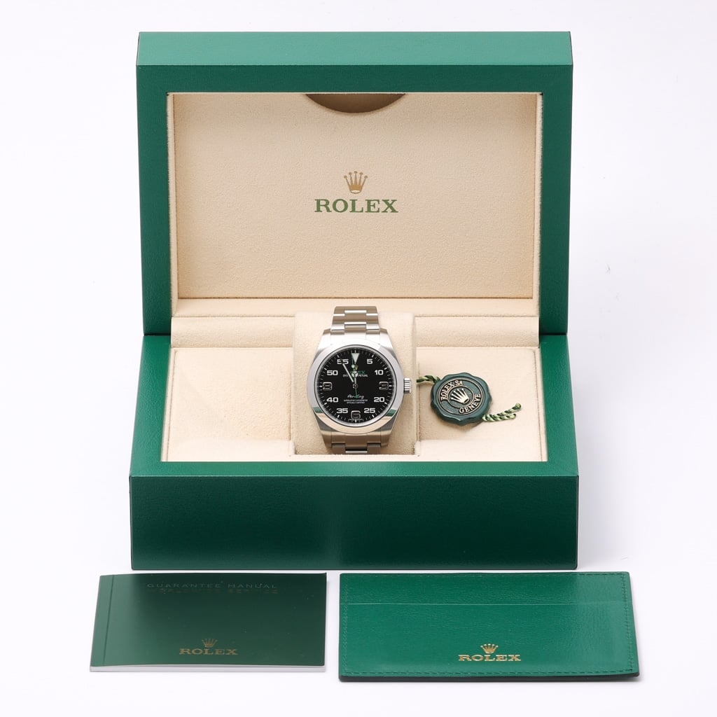 Powered by the Rolex Calibre 3131 automatic movement, the Air-King offers excellent precision, anti-magnetic protection, and a 48-hour power reserve. Its solid Oystersteel construction and screw-down crown provide durability and water resistance up to 100 meters, making it a reliable companion for everyday wear.