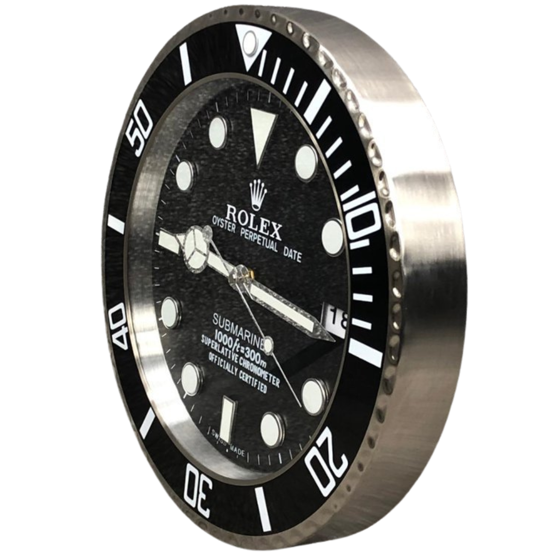 The stainless steel replica Rolex black face Submariner wall clock is an epitome of timeless elegance and meticulous craftsmanship, designed to bring the prestige of the renowned Rolex Submariner to your wall. Encased in a polished stainless steel frame, this wall clock radiates durability and sophistication, echoing the quality and luxury associated with the iconic Rolex brand. Measuring approximately 14 inches in height and width, its substantial presence makes it a captivating focal point in any setting.