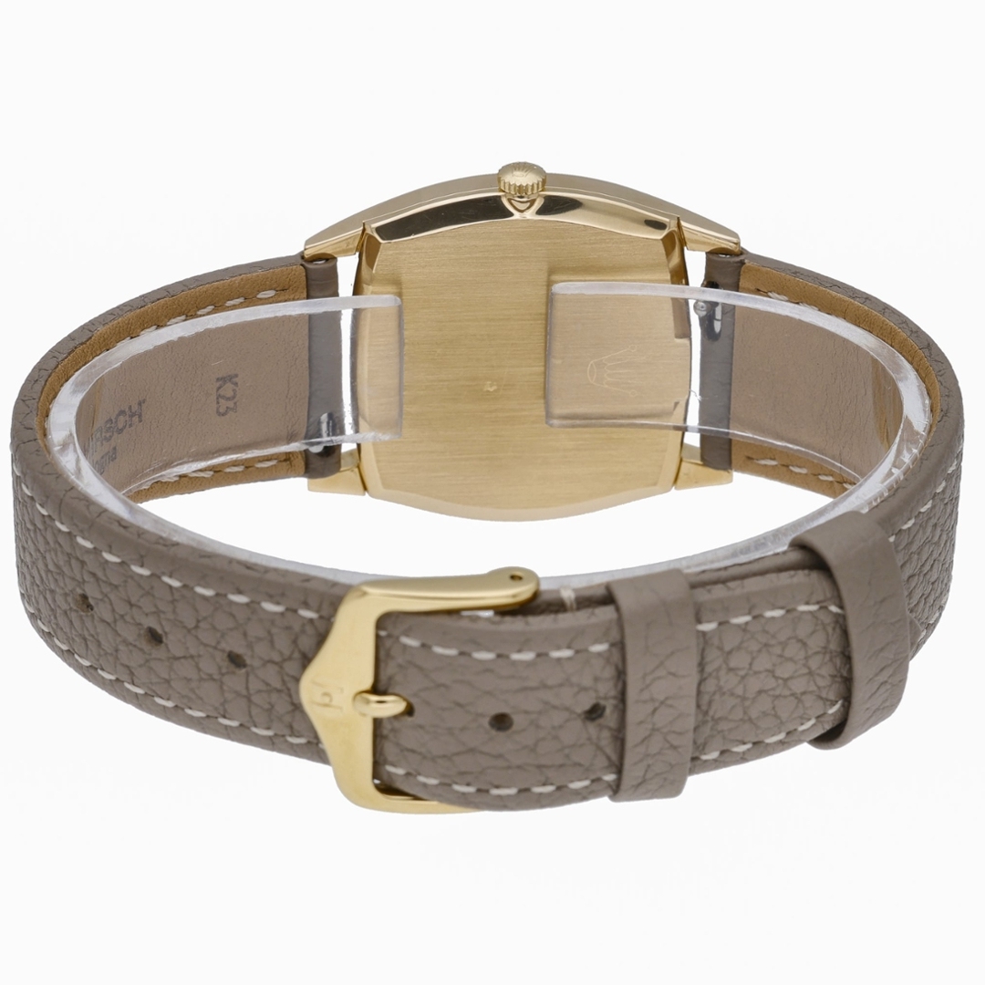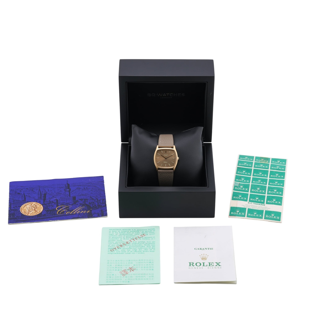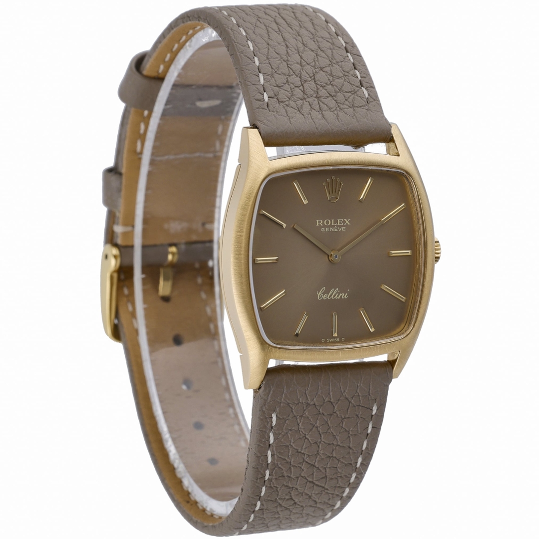A Rolex Cellini reference 3805 is crafted in 18ct yellow gold, offering a refined, understated interpretation of Rolex’s classic dress-watch design. The 31mm cushion-shaped case presents elegant proportions, paired with a brown leather strap and matching yellow gold clasp for a cohesive, period-correct aesthetic. The sunburst brown dial is clean and minimalist, with applied gold baton hour markers, slim gold hands, and the “Cellini” signature in script above six o’clock.
