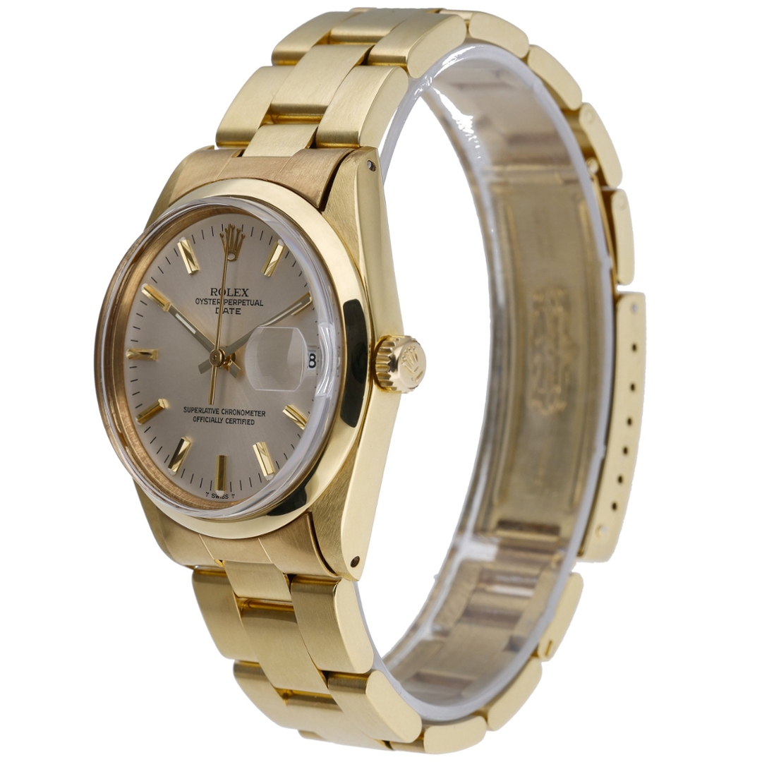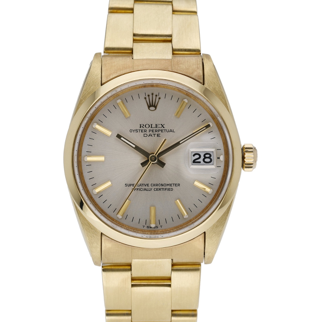 A Rolex Date, model 15505, embodies refined vintage elegance and the enduring craftsmanship for which Rolex is celebrated. Crafted in gold plate, this distinguished 34mm timepiece combines classic proportions with a timeless aesthetic. The silver dial features gold baton hour markers and matching hands, creating a clean, balanced look that reflects understated sophistication.