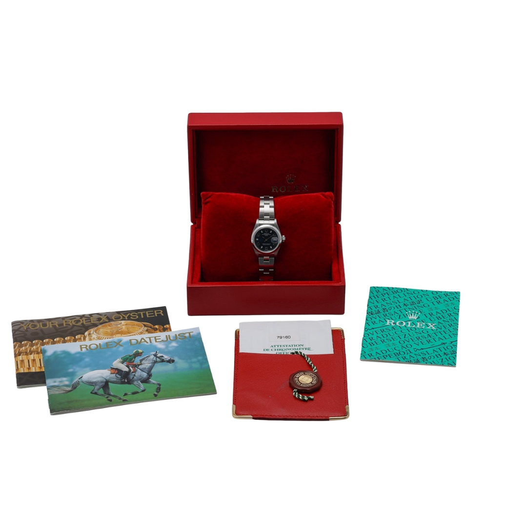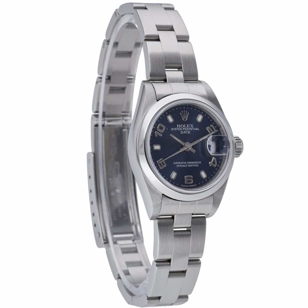 A Rolex Oyster Perpetual Date 79160 in stainless steel, featuring a vibrant blue dial that adds depth and character to its classic 26mm case. The smooth bezel keeps the profile clean and understated, while the distinctive Arabic and baton hour markers provide a subtle sport-inspired touch. The date display at 3 o’clock beneath the Cyclops lens ensures clear, practical functionality within its compact and elegant proportions.
