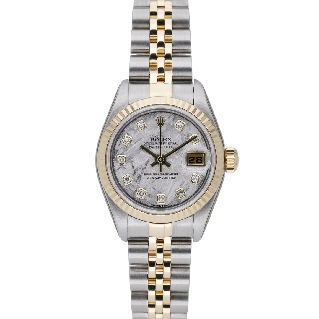 A Bi-Metal Rolex Datejust 26 Watch, crafted from stainless steel and 18ct yellow gold with a fluted bezel, presented on the iconic jubilee bracelet. This rare reference 79173 features a remarkable factory meteorite dial, beautifully complemented by original Rolex diamond hour markers. The natural patterning of the meteorite makes every example unique, ensuring no two dials are ever the same.
