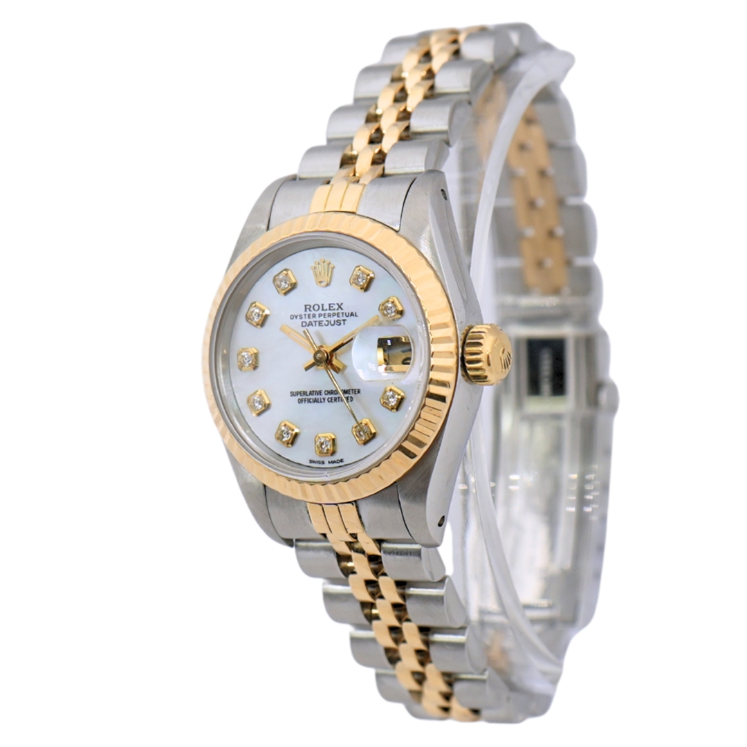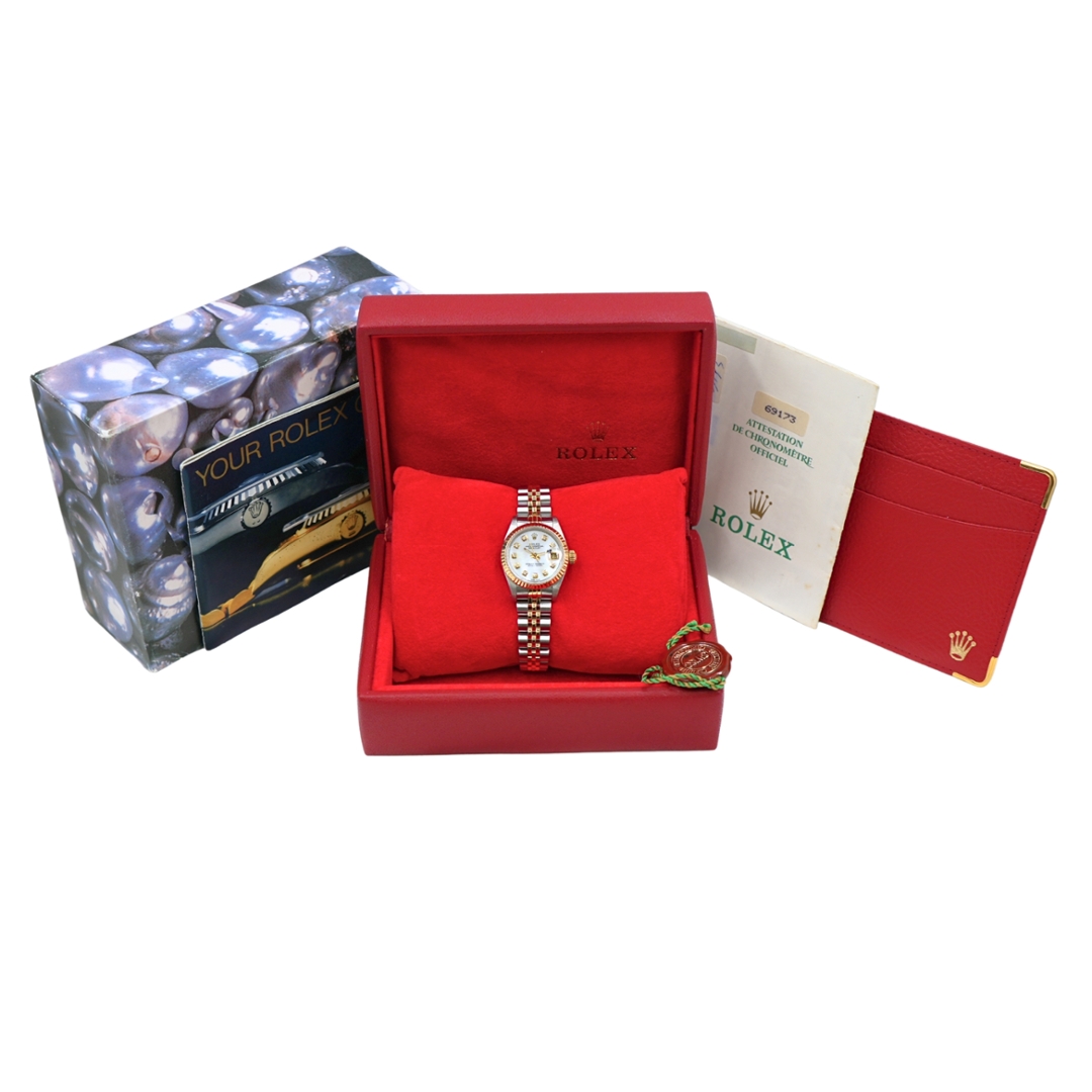 A Rolex Datejust, reference 69173, combining timeless elegance with luxurious modern detailing. Crafted from stainless steel and 18ct yellow gold, this 26mm model features an exquisite afterset diamond bezel framing a mesmerising afterset mother-of-pearl dial. The dial is enhanced with diamond-set hour markers, radiating sophistication and subtle glamour, while the classic Jubilee bracelet completes the watch with a perfect balance of comfort and refinement.