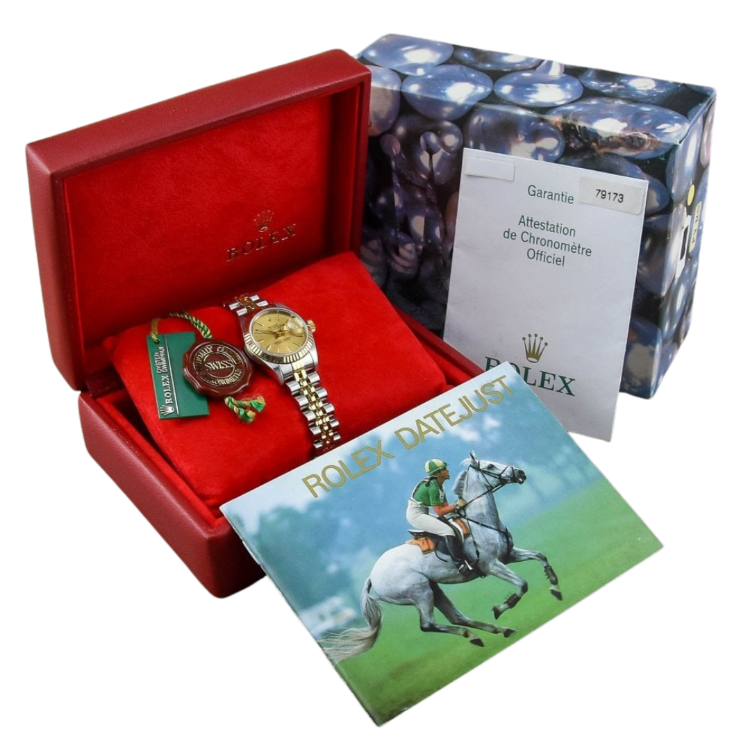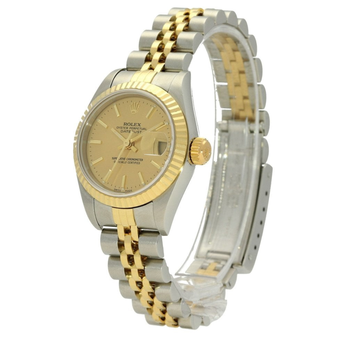 A Bi-Metal Rolex Datejust 26 that brings together classic Rolex elegance and timeless everyday wear. Crafted in stainless steel and 18ct yellow gold, this reference 69173 showcases the iconic fluted bezel and the refined proportions that have defined the Lady Datejust line for decades. The champagne dial presents a warm, understated finish, complemented by applied baton hour markers and the signature date window at 3 o’clock beneath the Cyclops lens.
