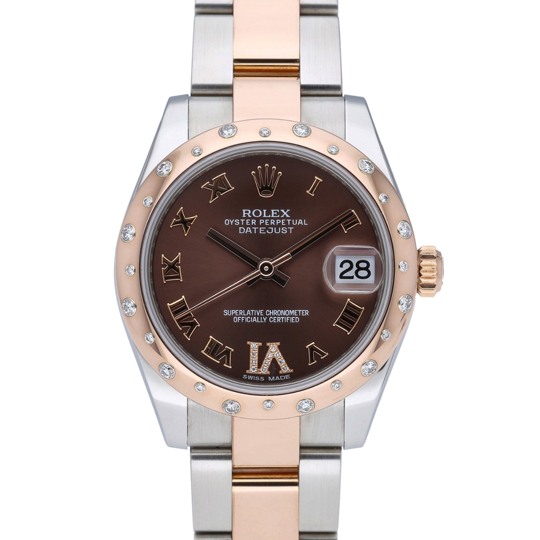 A Rolex Datejust 31 Watch in stainless steel and 18ct Everose gold, blending classic design with contemporary elegance. Reference 178341 features an original 18ct rose gold bezel set with scattered diamonds, adding a touch of sophistication to the iconic Datejust profile. The chocolate dial is accented by bold Roman numerals and an original Rolex diamond-set VI, offering a striking contrast that enhances its luxurious appeal.