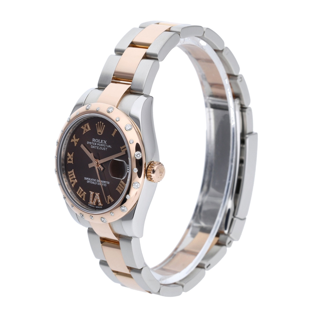 A Bi-Metal Rolex Datejust 31 Watch, Stainless Steel & 18ct Rose Gold with an Original 18ct Rose Gold Scattered Diamond Bezel on a Chocolate Roman Dial with an Original Rolex Diamond Numeral VI
