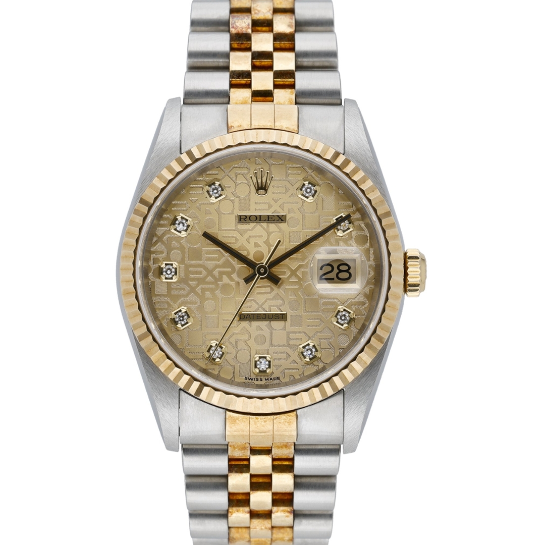 A bi-metal Rolex Datejust 36 watch crafted from stainless steel and 18ct yellow gold, featuring an exquisite champagne Jubilee dial adorned with original Rolex diamond hour markers. Model number 16233, this 2001 example embodies the perfect blend of timeless elegance and technical excellence. Powered by the Rolex automatic movement, it delivers exceptional precision and reliability, a hallmark of the Datejust collection.
