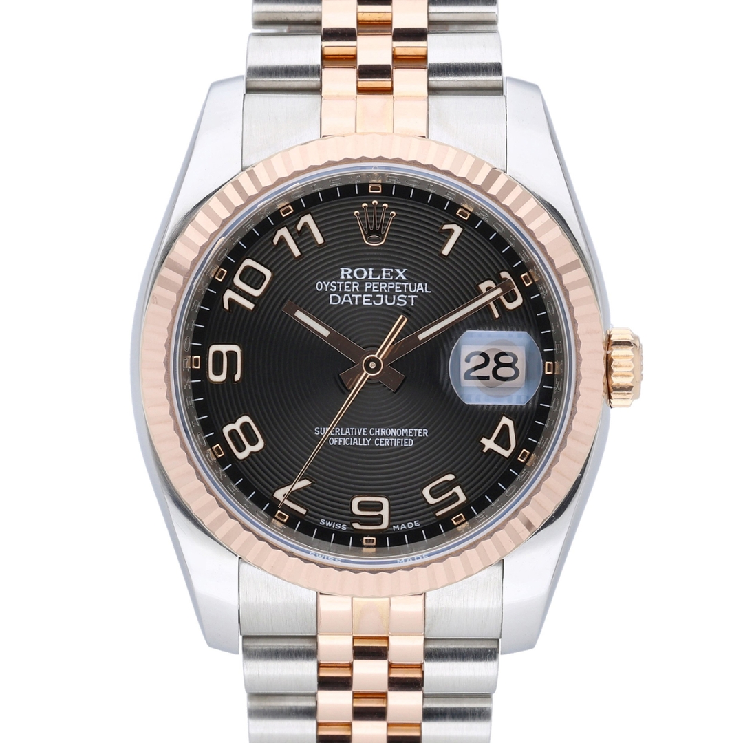 A Rolex Datejust 36, this reference 116231 combines timeless design with a highly distinctive dial configuration. It is crafted in Oystersteel and 18ct Everose gold, features a Jubilee bracelet, and is fitted with a fluted bezel. What truly sets this example apart is its rare black concentric dial with Arabic numerals — a striking aesthetic that showcases Rolex’s commitment to detail and refinement. The engraved circular motif creates a subtle depth and ever-changing play of light, while the Everose gold Arabic hour markers provide a warm contrast against the deep black surface.