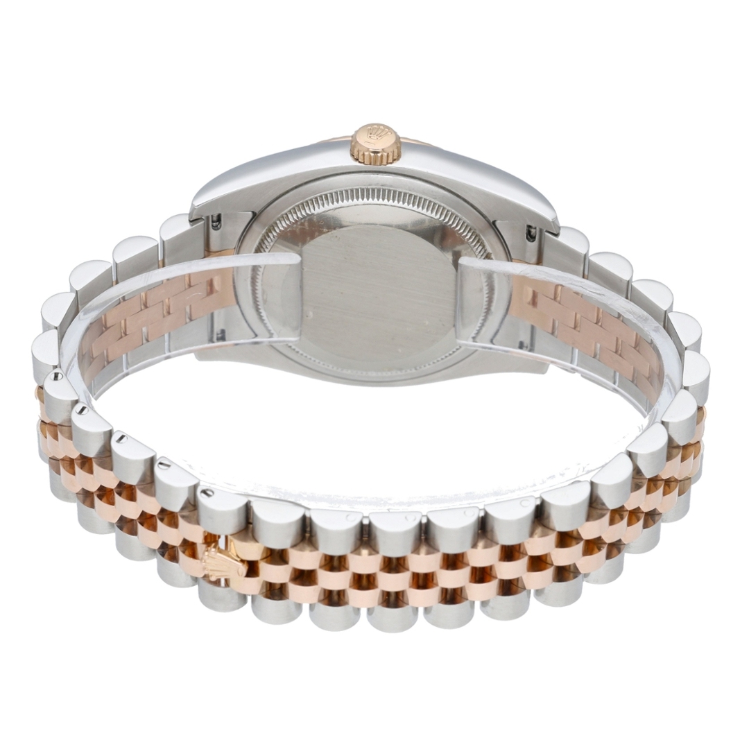 At 3 o’clock, the date display is magnified by the iconic Cyclops lens, ensuring perfect legibility — a hallmark of the Datejust since its introduction in 1945. The watch is powered by the self-winding Calibre 3135, a movement renowned for its precision and robustness, certified as a Swiss Chronometer by COSC.
