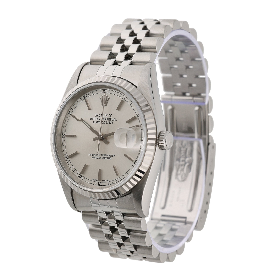 A Rolex Datejust Watch, Stainless Steel with an 18ct White Gold Bezel on a Silver Dial