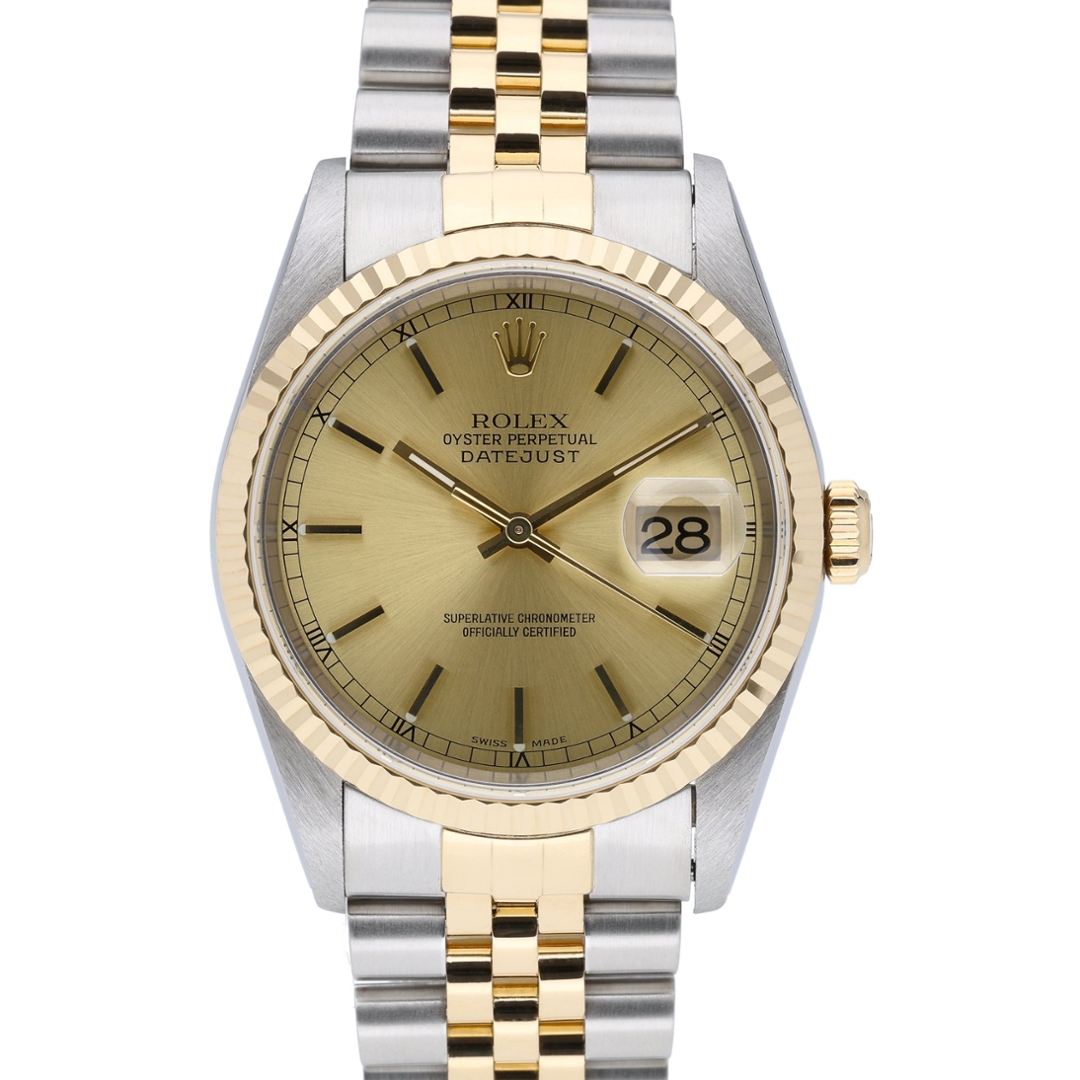 A Rolex Datejust 36, reference 16233, stands as one of the most iconic expressions of Rolex’s design philosophy, perfectly balancing elegance and practicality. This bi-metal example combines robust stainless steel with 18ct yellow gold, showcasing the timeless two-tone finish that has long defined the collection. The champagne dial, complete with applied hour markers, is enhanced by the signature date display at 3 o’clock beneath the cyclops lens, ensuring instant legibility. Framed by the fluted bezel, this watch embodies the sophistication that makes the Datejust a benchmark in luxury watchmaking.