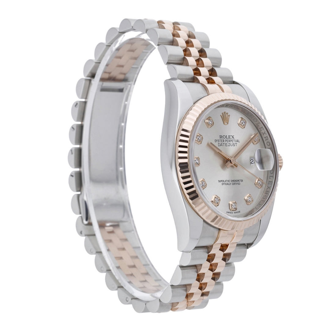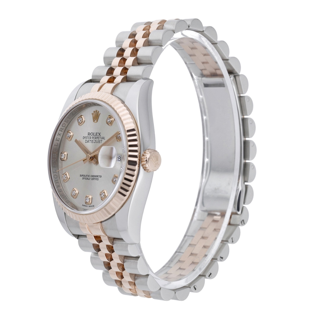 A Bi-Metal Rolex Datejust 36 Watch, Stainless Steel & 18ct Rose Gold with an 18ct Rose Gold Fluted Bezel on a Silver Dial with Original Rolex Diamond Numerals