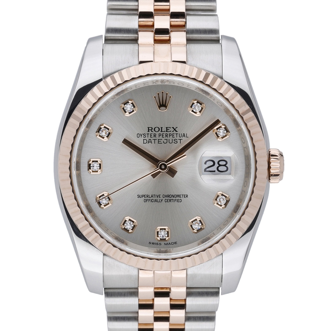 A Bi-Metal Rolex Datejust 36, model 116231, perfectly captures the essence of refined luxury and enduring Rolex craftsmanship. Crafted from stainless steel and 18ct Everose gold, this 36mm model features the iconic fluted bezel — rendered here in warm rose gold, adding a distinctive touch of sophistication. The silver dial provides an elegant contrast, beautifully complemented by original factory-set Rolex diamond hour markers that catch the light with understated brilliance.