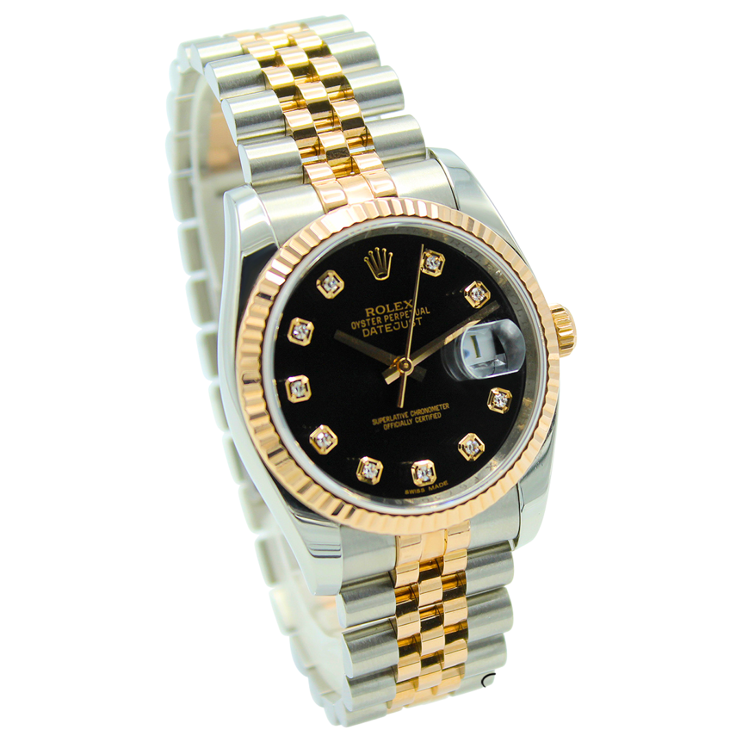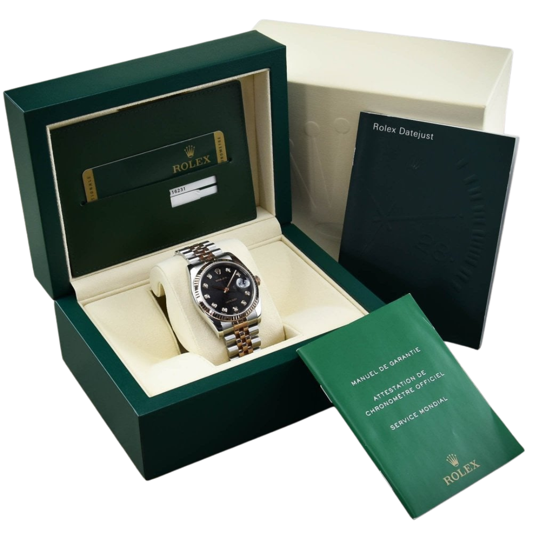 A striking and luxurious bi-metal Rolex Datejust 36, this 116231 pairs stainless steel with 18ct Everose gold, offering an unmistakable sense of refinement. The 18ct Everose fluted bezel frames a deep black dial that gains extra character from the original factory diamond hour markers, each one applied with precision for superb brilliance against the dark background. At 36mm, it delivers the perfect balance of presence and elegance, making it an ideal daily companion with unmistakable Rolex charm.