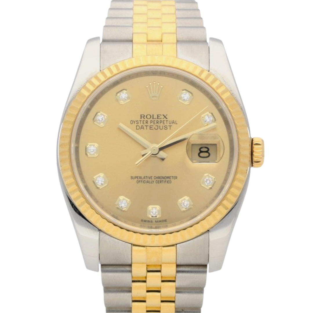 This immaculate 2011 Rolex Datejust 36, reference 116233, presents the perfect balance of stainless steel and 18ct yellow gold in one of Rolex’s most iconic and versatile designs. The champagne dial is beautifully complemented by original Rolex diamond-set hour markers, giving the watch a radiant, luxurious presence without ever feeling overstated. Its fluted yellow-gold bezel adds the unmistakable classic Rolex signature, catching the light with every movement and elevating the piece's elegance.