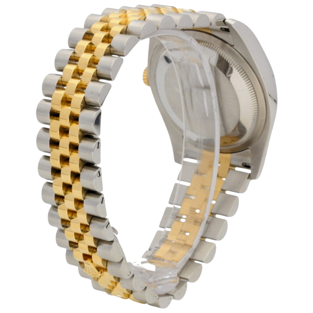 Inside, the watch is powered by the reliable and well-regarded Rolex calibre 3135, a movement known for its durability, accuracy and long-standing place in the Datejust line. The five-link Jubilee bracelet in steel and yellow gold enhances comfort while completing the watch’s timeless aesthetic. With its 36mm case proportions, this model remains one of the most wearable configurations in the entire Datejust family, suitable for both everyday wear and more formal occasions.