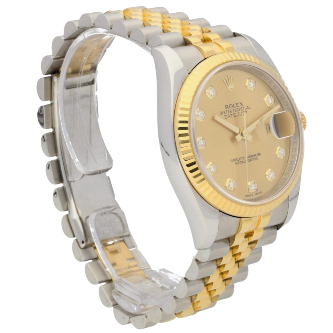A Bi-Metal Rolex Datejust Watch, Stainless Steel and 18ct Yellow Gold with a Yellow Gold Fluted Bezel and a Champagne Dial with Original Rolex Diamond Numerals