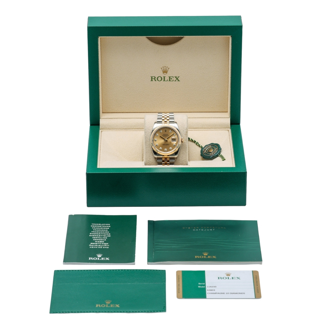 Presented in immaculate condition, this example comes complete with its original Rolex paperwork, box, and accessories, along with a 12-month WLC warranty for added confidence. The combination of the diamond-set champagne dial, precious-metal detailing, and classic proportions makes this 116233 a particularly desirable version of the modern Datejust — a refined, enduring choice with true long-term appeal.