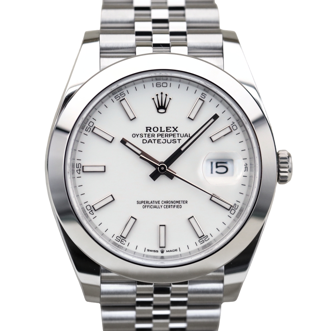 The 41mm Oyster case gives the watch a contemporary presence while maintaining the classic proportions that define the Datejust lineage. The smooth bezel, paired with the crisp white dial and luminous baton hour markers, delivers an understated sophistication suitable for both formal and everyday wear. The Jubilee bracelet ensures comfort and durability, completing this modern yet timeless design.