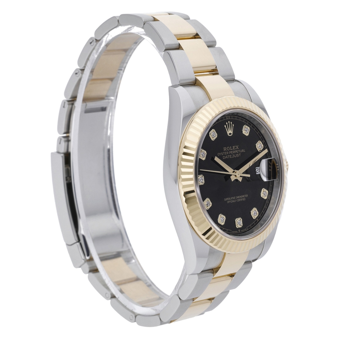 A Bi-Metal Rolex Datejust 41 Watch, Stainless Steel and 18ct Yellow Gold with a Yellow Gold Fluted Bezel on a Black Dial with Original Rolex Diamond Numerals