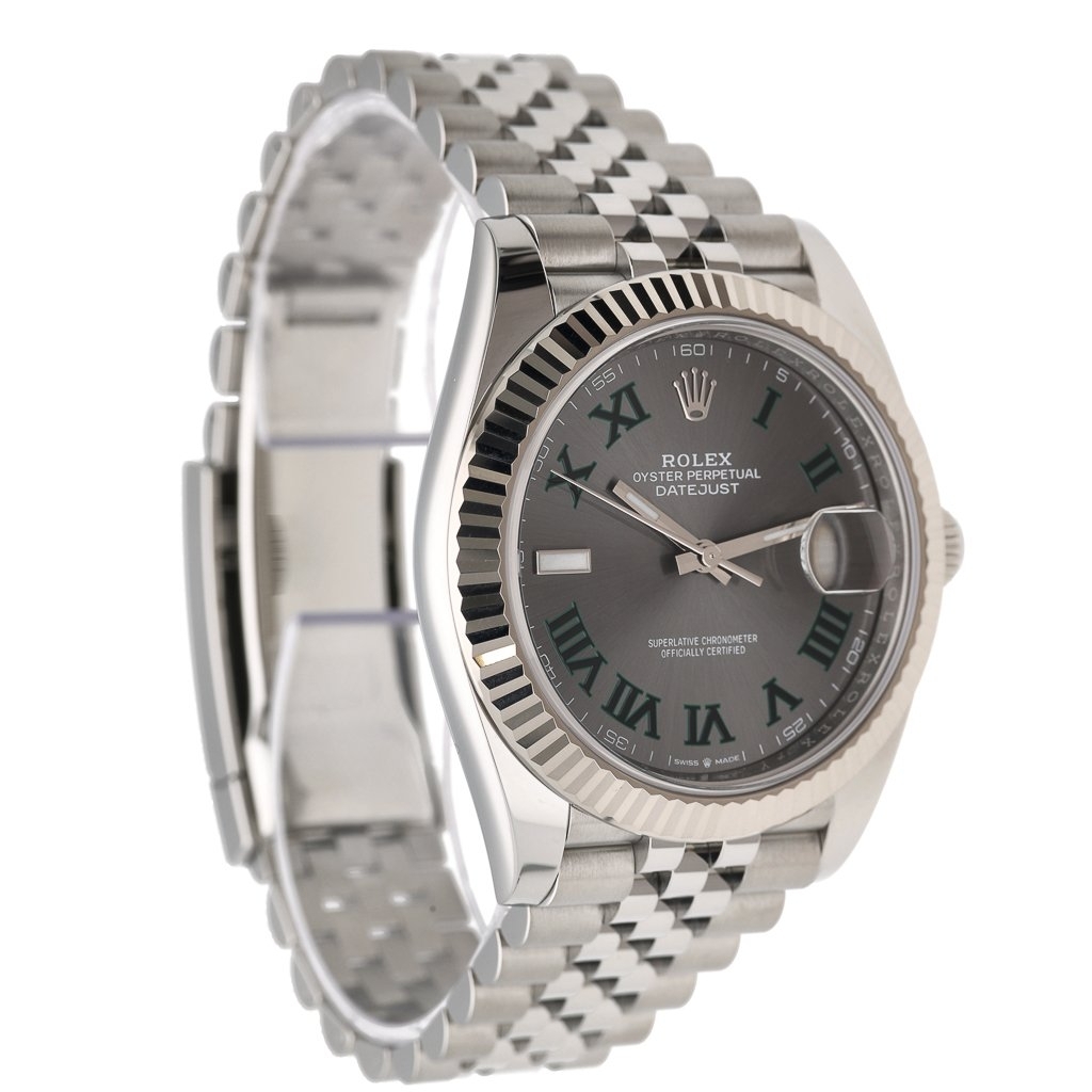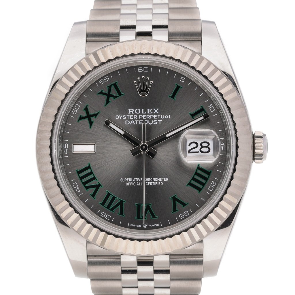 A Rolex Datejust 41 reference 126334, crafted from stainless steel and 18ct white gold, presented with the sought-after slate grey “Wimbledon” dial — featuring distinctive green Roman numerals and a refined sunray finish that shimmers under light. The fluted 18ct white gold bezel adds a sophisticated touch, perfectly complementing the elegance of the Jubilee bracelet.