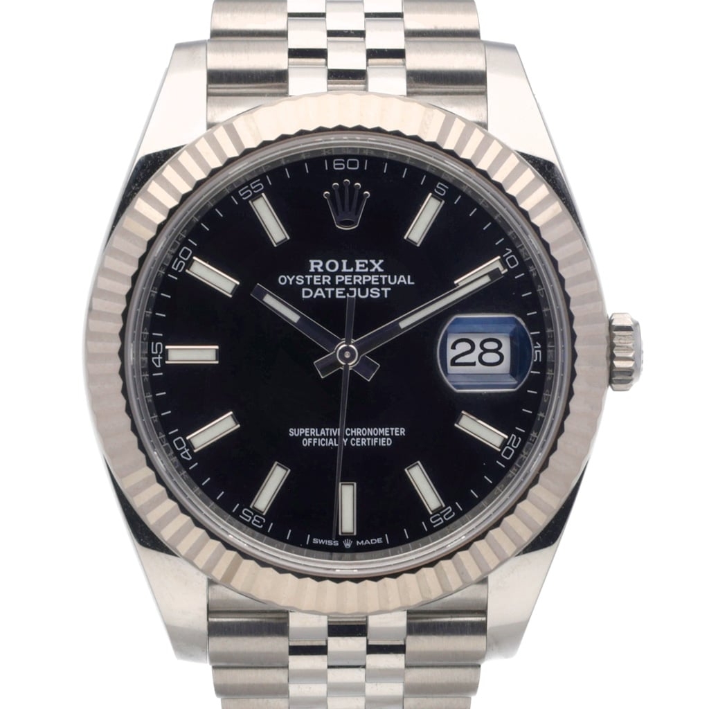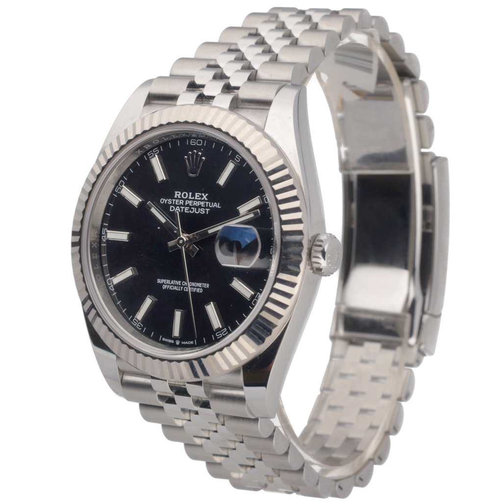 A Rolex Datejust 41 Watch, Stainless Steel with an 18ct White Gold Fluted Bezel on a Black Dial.
