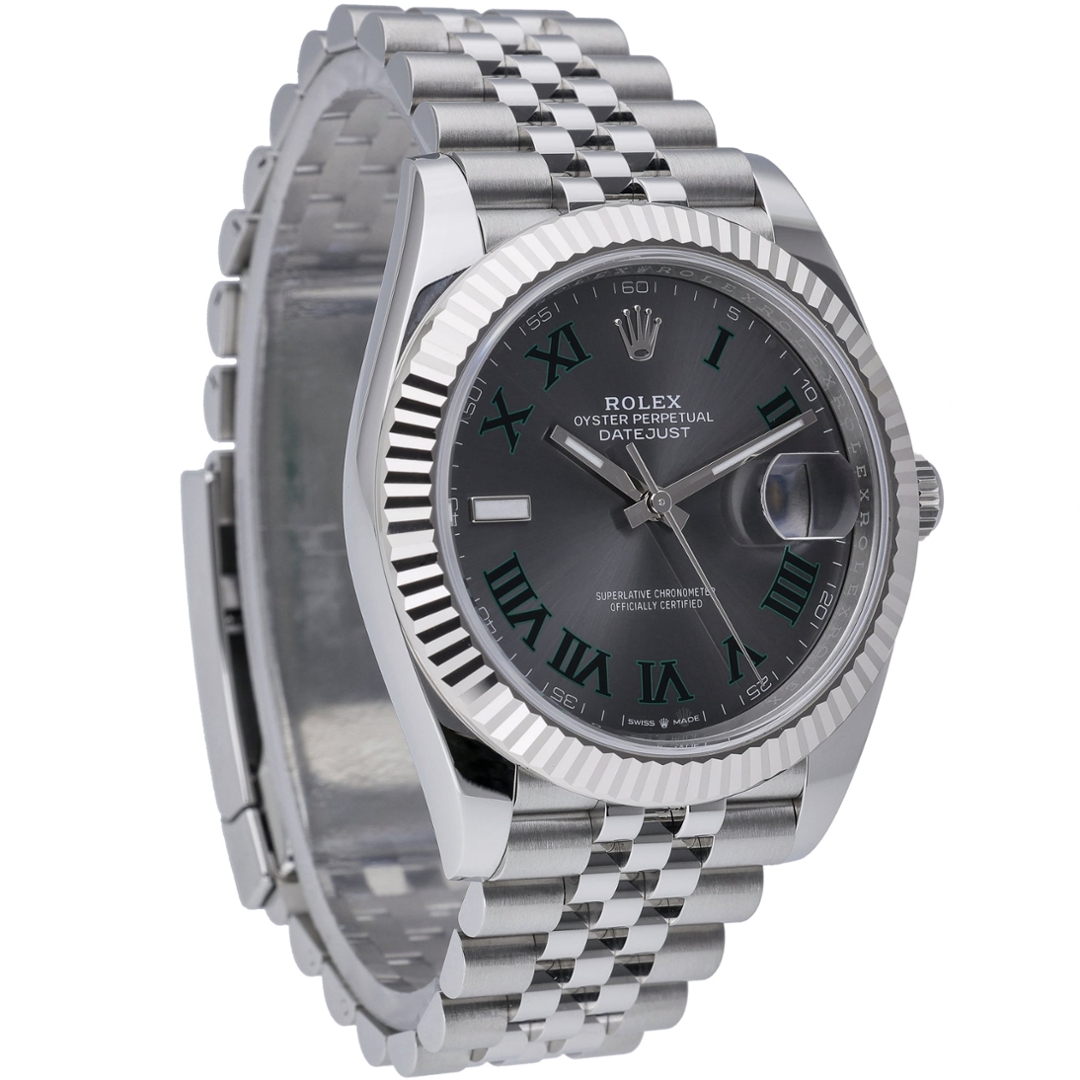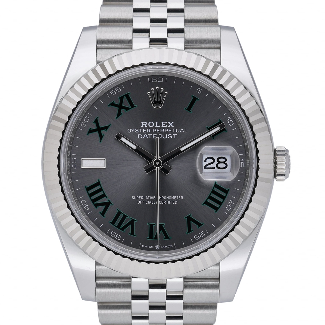 A Rolex Datejust 41 "Wimbledon" Watch that captures the essence of refined sophistication and enduring elegance. Crafted from stainless steel and 18ct white gold, this model strikes a perfect balance between strength and luxury. The captivating slate grey dial features striking green Roman numeral hour markers, adding a distinctive pop of colour while maintaining a classic air of restraint. Its fluted white gold bezel catches the light beautifully, creating a subtle contrast against the smooth lines of the Oyster case and the iconic Jubilee bracelet.