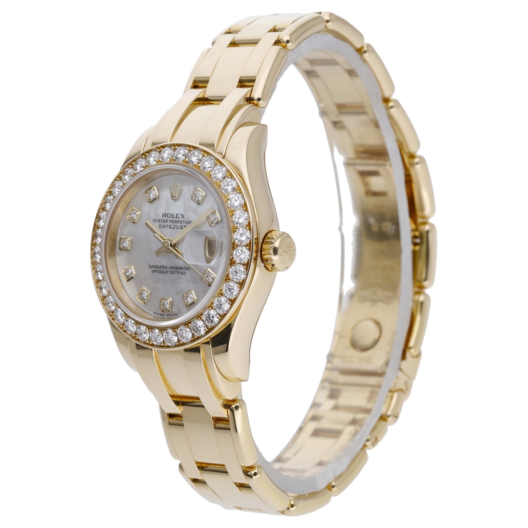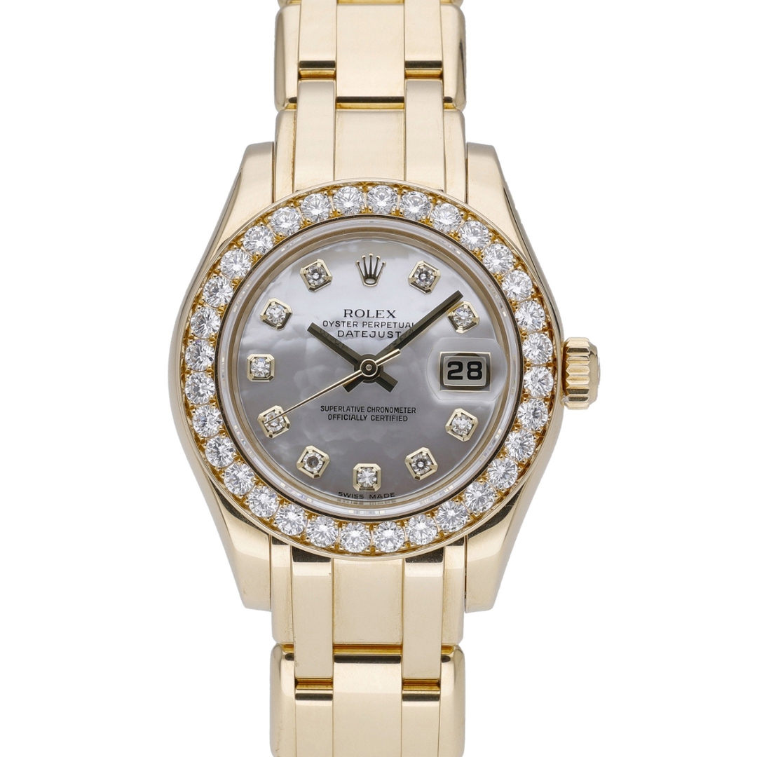A Rolex Datejust Pearlmaster crafted entirely from 18ct yellow gold, offering one of the most luxurious expressions within the Datejust line. This reference 80298 features a stunning diamond bezel paired with a beautifully iridescent mother-of-pearl dial, set with diamond hour markers that elevate the watch with exceptional brilliance and presence.