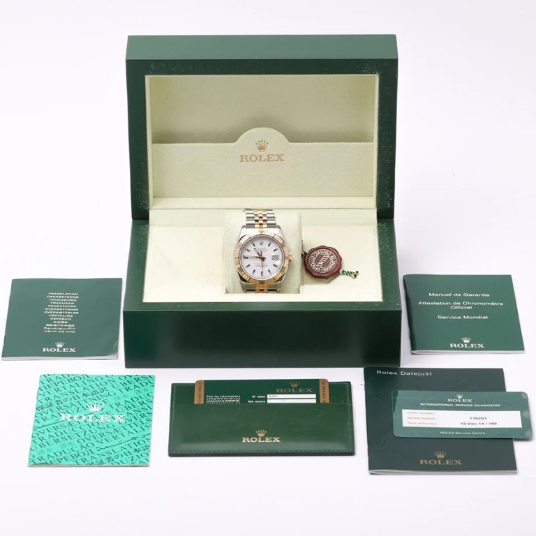A bi-metal Rolex Datejust Turn-O-Graph watch, reference 116263, offered in immaculate condition. Crafted from stainless steel and 18ct yellow gold, this 36mm model features the distinctive yellow gold rotating fluted bezel, originally developed as a timing tool and a defining trait of the Turn-O-Graph line. The clean white dial is complemented by gold baton hour markers, red seconds hand, and matching red date numeral beneath the Cyclops lens.