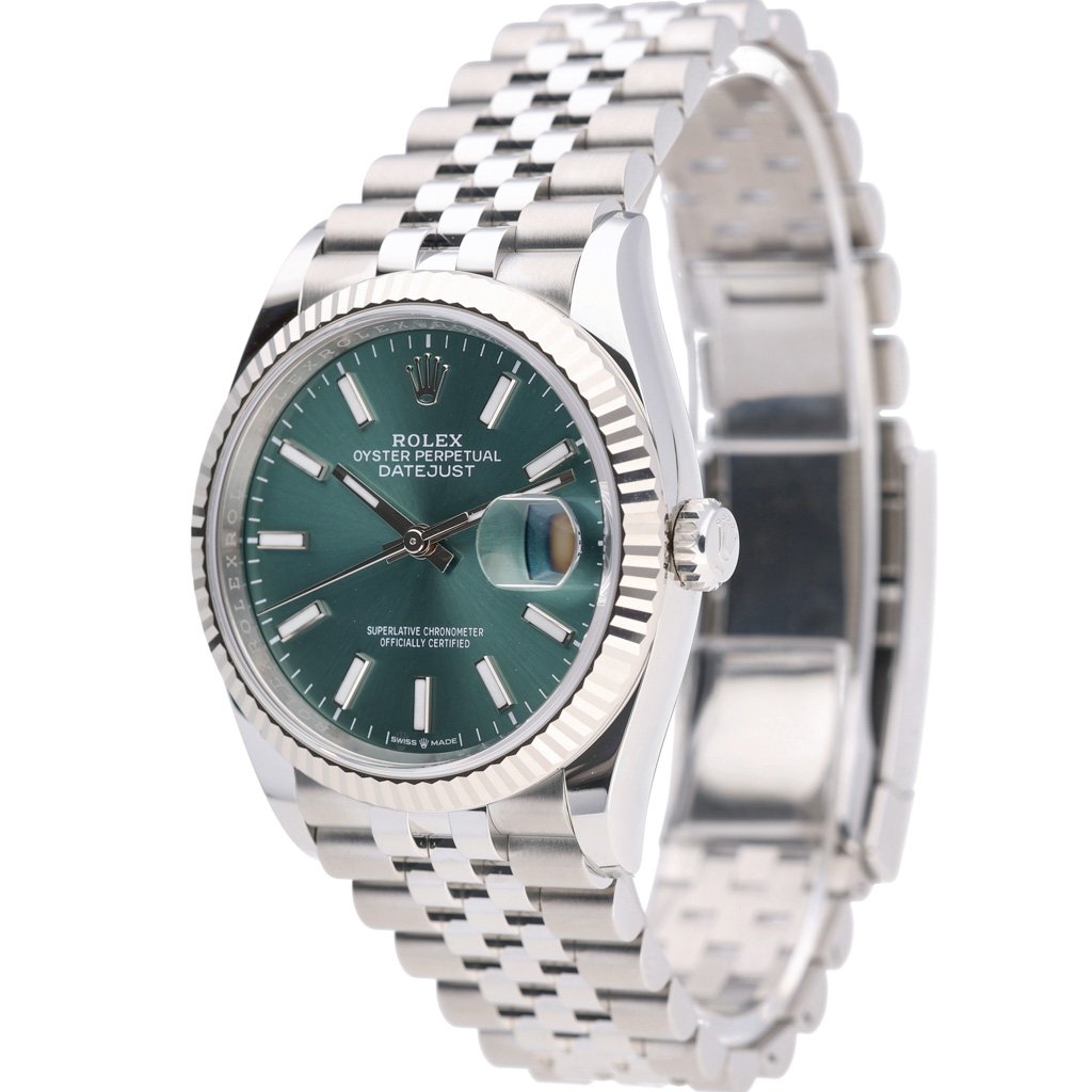 A Rolex Datejust 36, model 126234, is a refined expression of contemporary elegance and Rolex’s exceptional craftsmanship. Crafted from stainless steel and 18ct white gold, this 36mm model features the signature fluted bezel — a timeless hallmark of sophistication. The standout mint green dial offers a fresh and modern aesthetic, complemented by luminous baton hour markers and polished hands that ensure excellent legibility. The date display at three o’clock, magnified by the Cyclops lens, completes the watch’s classic and distinctive look.