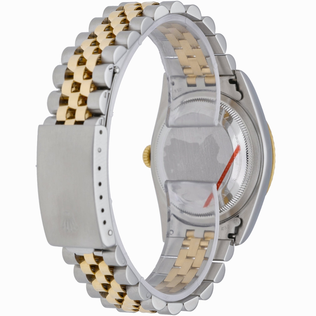 This bi-metal Rolex Datejust 36 reference 16233 features the classic 36mm Oyster case in stainless steel, paired with an 18ct yellow gold fluted bezel and matching Jubilee bracelet. The champagne Jubilee dial is distinguished by the repeating Rolex motif and original Rolex diamond numerals, complemented by gold hands and applied coronet. An acrylic crystal with cyclops date magnification completes the familiar vintage Datejust profile.