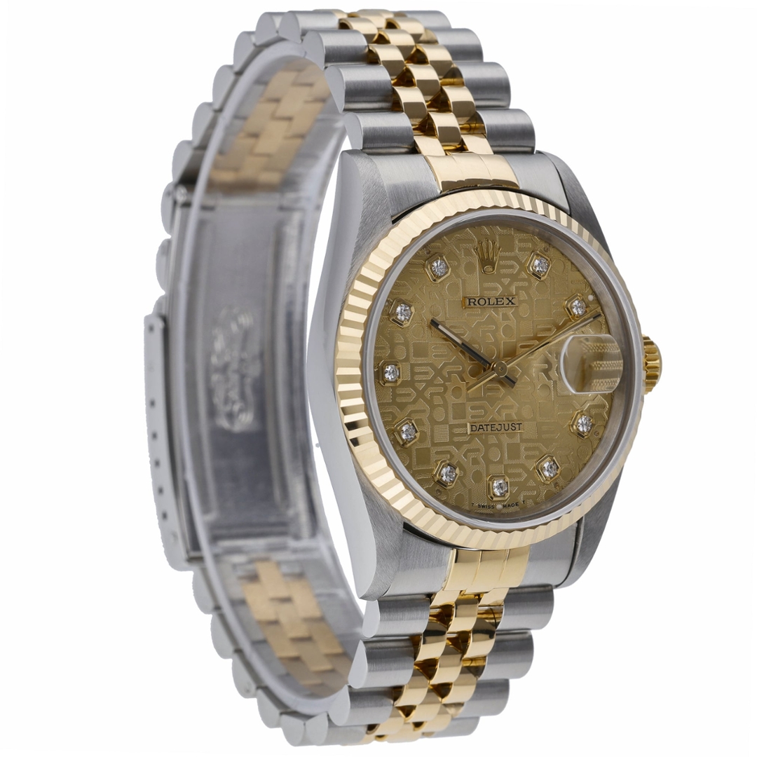 A Bi-Metal Rolex Datejust 36 Watch, Stainless Steel & 18ct Yellow Gold on a Jubilee Champagne Dial with Original Rolex Diamond Numerals