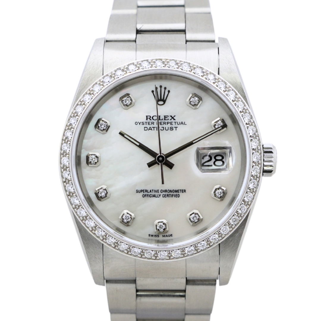 A Rolex Datejust reference 16220 from 2005, presented in stainless steel with a 36mm Oyster case. This example is fitted with an afterset diamond bezel and an afterset white mother-of-pearl dial with diamond hour markers, offering a more contemporary, jewellery-led aesthetic while retaining the classic proportions that define the Datejust.