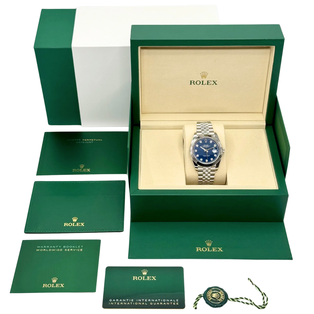 A Rolex Datejust 41 in stainless steel, fitted with an 18ct white gold fluted bezel and a rich blue sunburst dial set with original Rolex diamond hour markers. Reference 126334 represents the contemporary 41mm evolution of the Datejust, balancing strong wrist presence with refined detailing. The contrast between the crisp steel Oyster case, luminous diamonds, and the classic fluted bezel gives this configuration a distinctly elevated yet versatile character.
