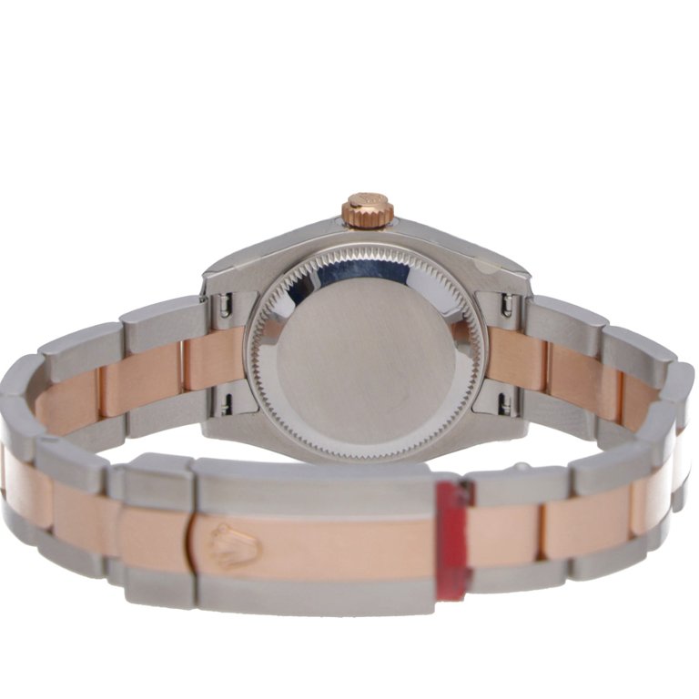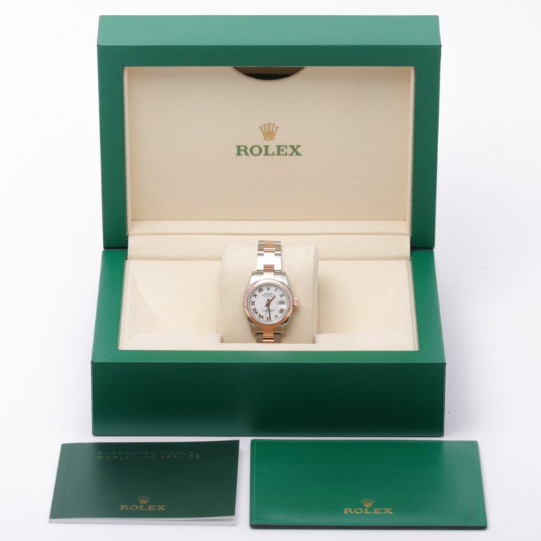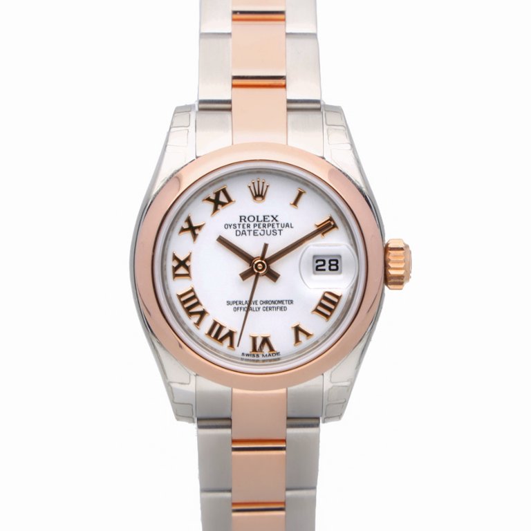 A bi-metal Rolex Datejust reference 179161 is presented in stainless steel and 18ct Everose gold, featuring the classic 26mm Oyster case. The watch is fitted with a white mother-of-pearl dial, complemented by applied rose gold Roman numerals and matching hands, with the signature date display at 3 o’clock beneath the Cyclops lens. The smooth Everose gold bezel provides a refined contrast against the Oystersteel case, maintaining the Datejust line's balanced proportions.