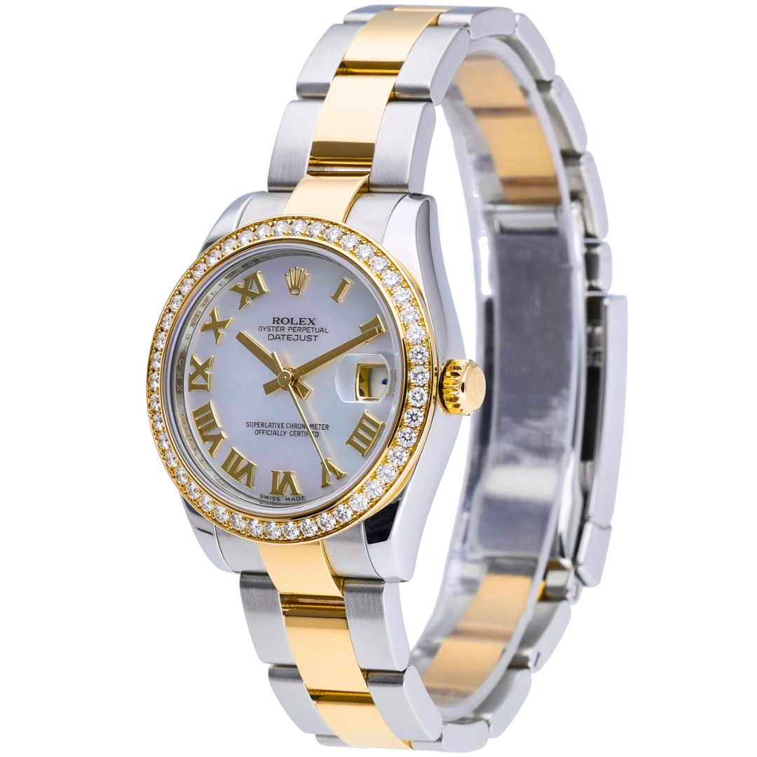 A bi-metal Rolex Datejust reference 178383 is crafted in stainless steel and 18ct yellow gold, combining classic Rolex design with refined diamond detailing. The 31mm Oyster case is fitted with an original Rolex factory-set diamond bezel, adding elevated presence while retaining the model’s timeless proportions. The mother-of-pearl dial displays natural tonal variation, enhanced by applied yellow gold Roman numerals and the signature date aperture at three o’clock beneath the Cyclops lens.