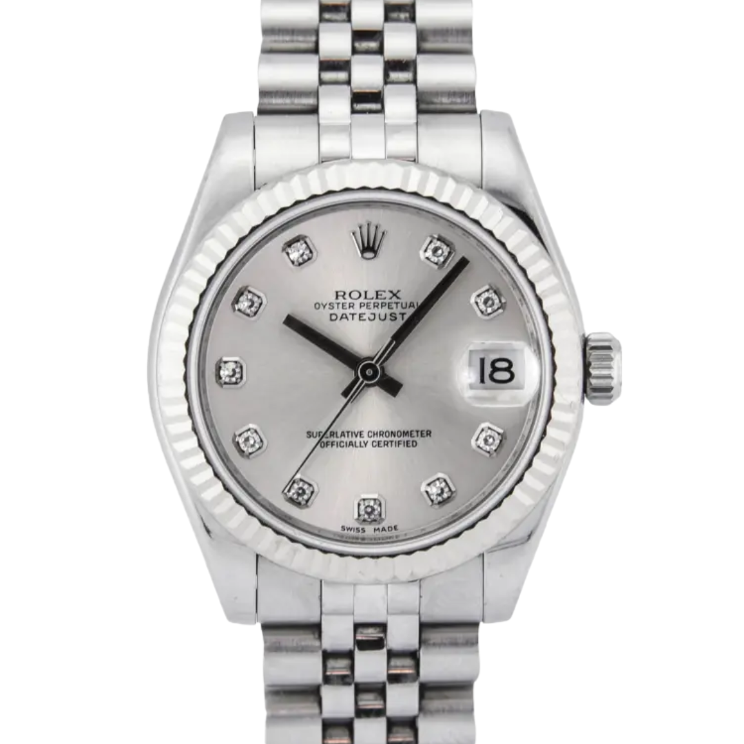 This Rolex Datejust reference 178274 is a refined bi-metal example, combining stainless steel with an 18ct white gold fluted bezel and a silver dial set with original factory Rolex diamond numerals. Sized at 31mm, it offers a perfectly balanced profile that suits both everyday wear and more formal settings, with the diamond markers adding subtle brilliance without overwhelming the classic Datejust aesthetic.