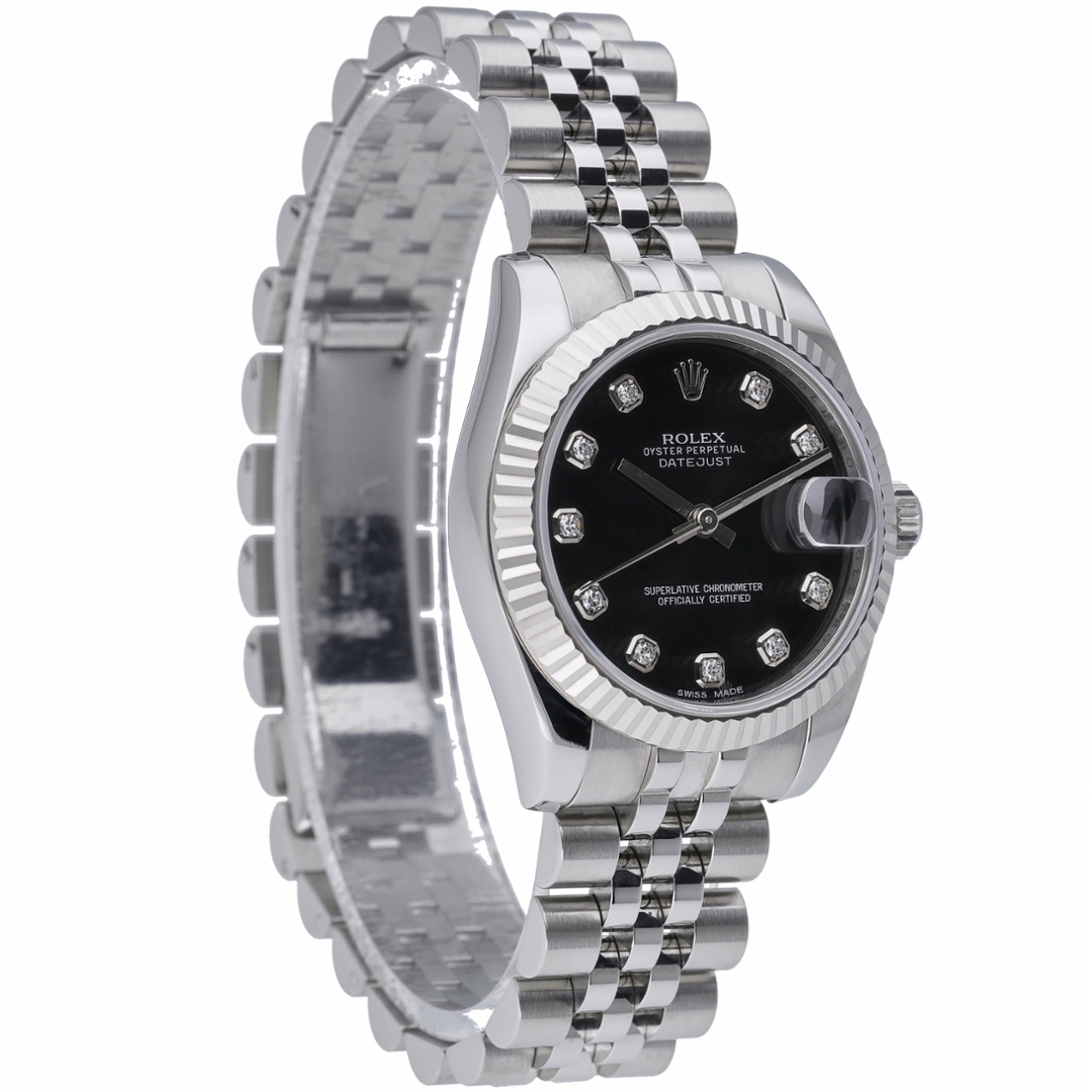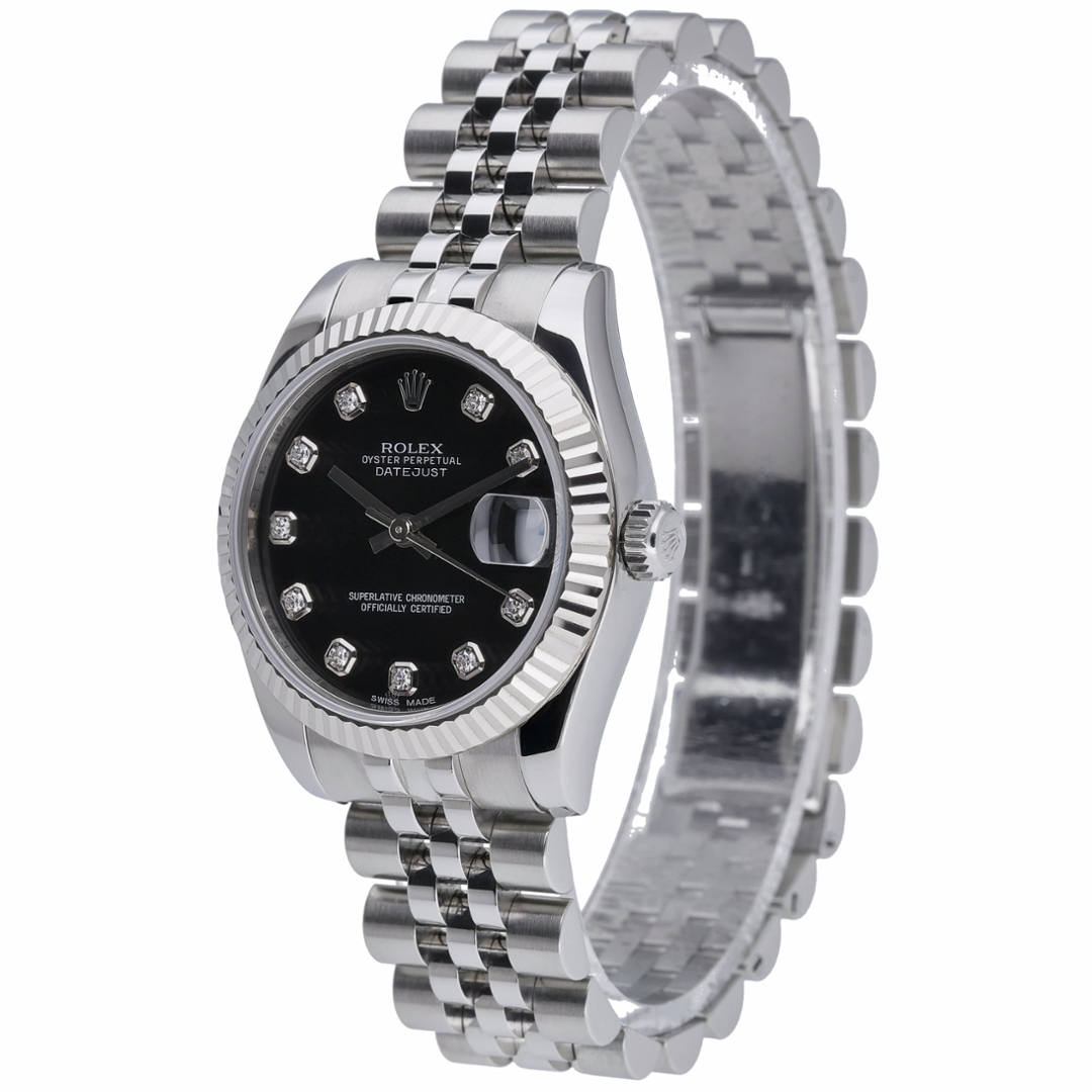 A Rolex Datejust 178274 in stainless steel, featuring a black dial set with original Rolex diamond hour markers and a fluted white gold bezel. The 31mm Oyster case offers elegant, balanced proportions, ideal for those seeking a refined yet versatile wrist presence. The deep black dial provides striking contrast against the diamond-set numerals, while the date display at 3 o’clock beneath the Cyclops lens maintains the collection’s unmistakable identity.