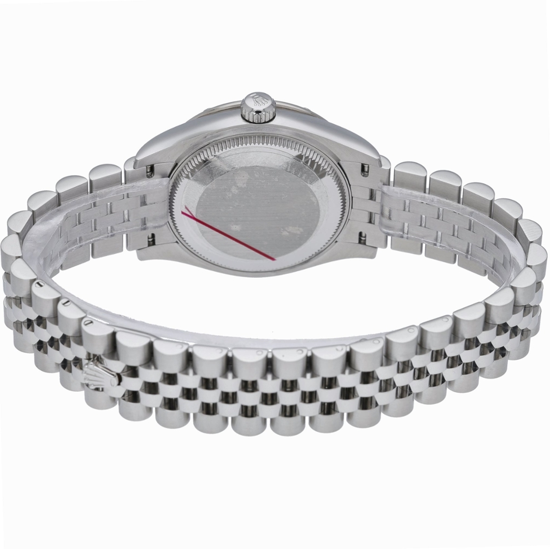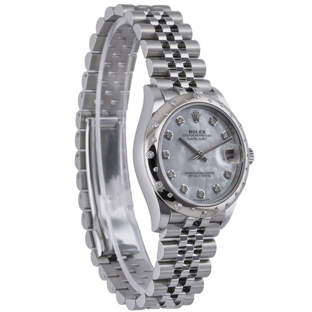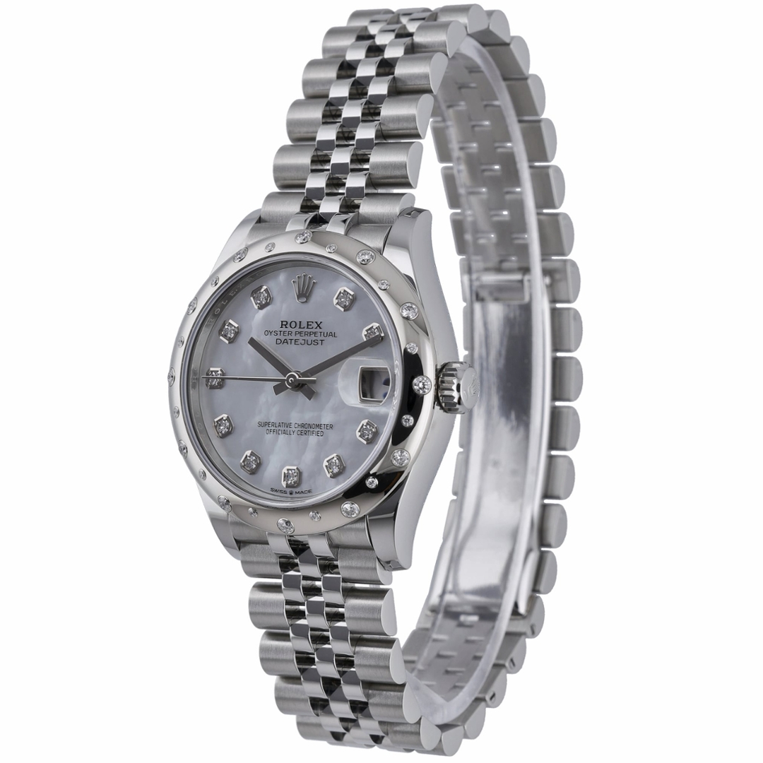 A 2022 Rolex Datejust 31, reference 278344RBR, crafted in stainless steel and distinguished by its original scattered diamond bezel. The 31mm Oyster case offers refined proportions, elevated by a luminous mother-of-pearl dial set with original Rolex diamond hour markers. Each dial displays its own natural patterning, ensuring no two examples are identical, while the date aperture at 3 o’clock beneath the Cyclops lens maintains the model’s signature functionality.