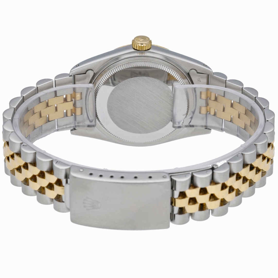 This bi-metal Rolex Datejust reference 16013 presents the classic 36mm Oyster case in stainless steel with an 18ct yellow gold fluted bezel, paired with the original champagne dial. The dial features applied gold baton hour markers with matching hands, framed by an acrylic crystal with cyclops date magnification. The screw-down crown and Oyster case construction deliver the robustness that defines the Datejust line from this era.