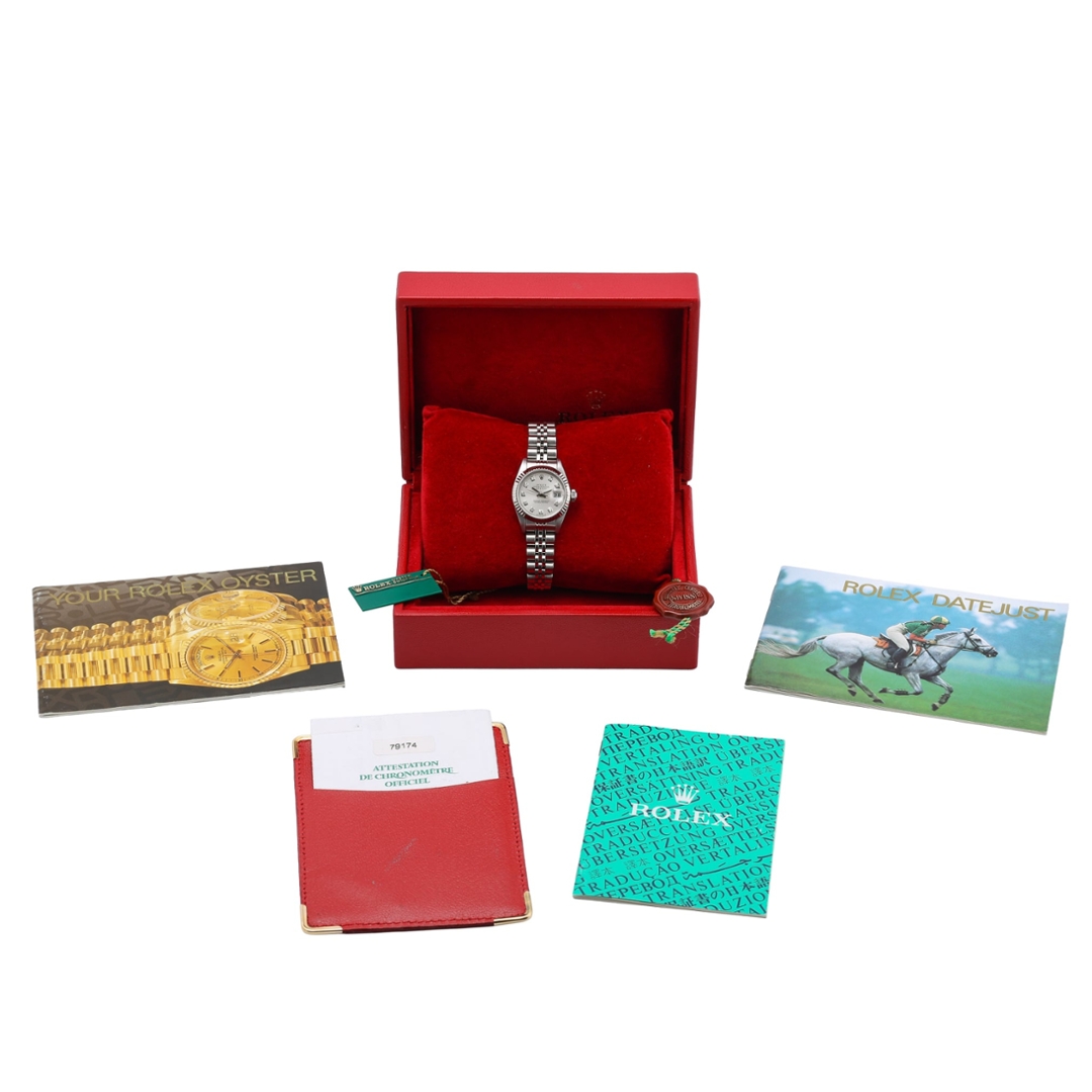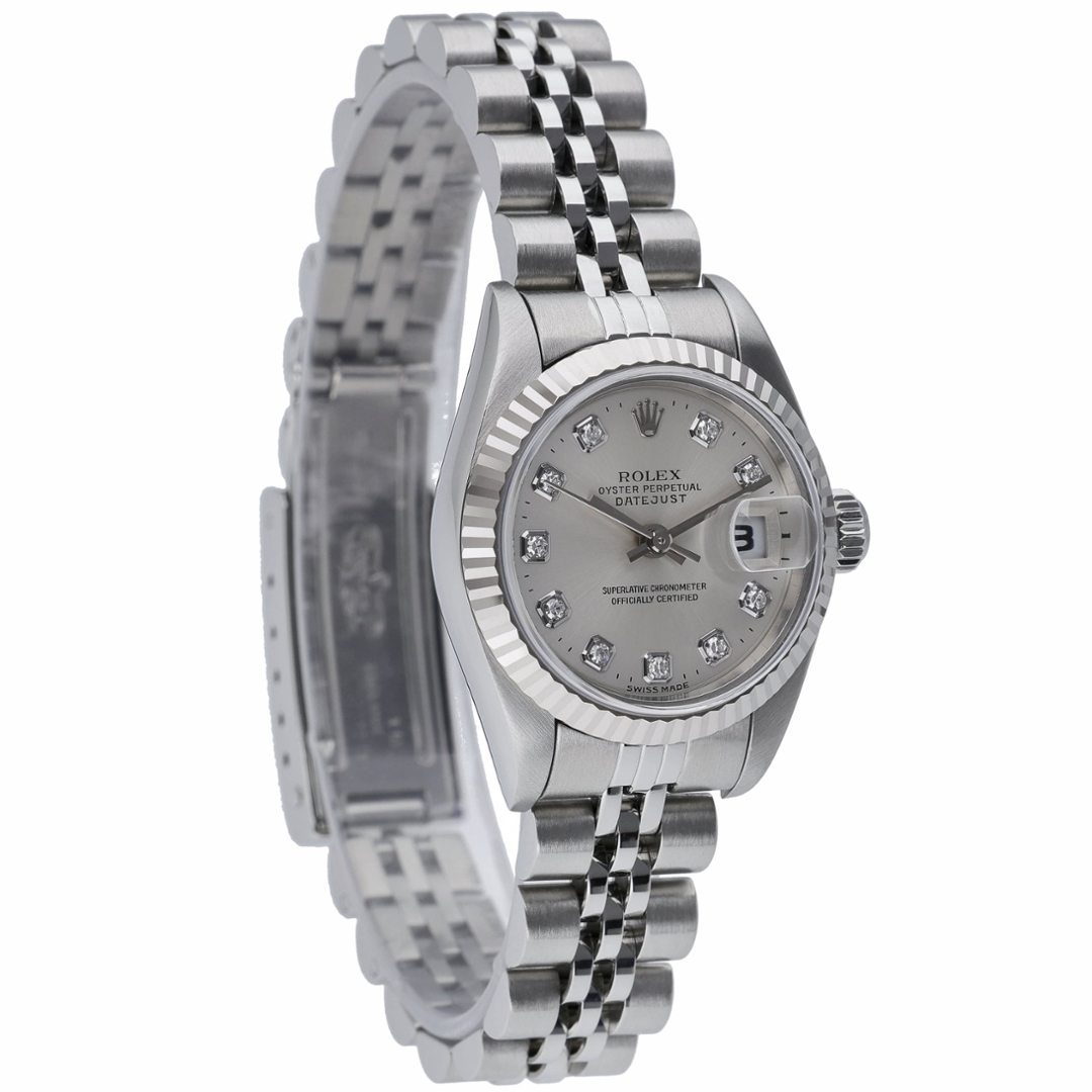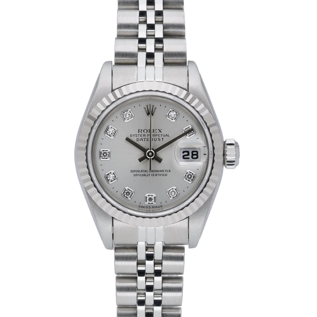 A 2001 Rolex Datejust 79174 in stainless steel and 18ct white gold, featuring a fluted white gold bezel and a silver mother-of-pearl dial set with original Rolex diamond hour markers. The 26mm Oyster case offers elegant, refined proportions, perfectly suited to those seeking a classic and discreet wrist presence. The natural iridescence of the mother-of-pearl dial ensures each piece is unique, shifting subtly in tone under different light, while the date display at 3 o’clock beneath the Cyclops lens preserves the Datejust’s timeless identity.