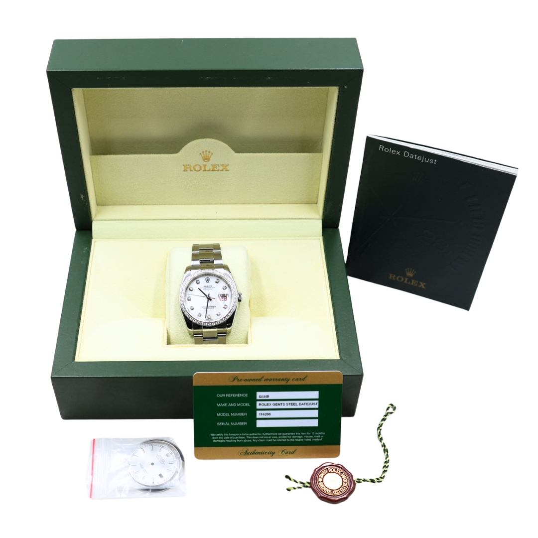 A Rolex Datejust reference 116200 in stainless steel, presented in its original box and accompanied by authenticity paperwork and a Watch Register certificate. The 36mm Oyster case delivers classic Datejust proportions, offering a versatile and highly wearable configuration within the modern 6-digit generation.