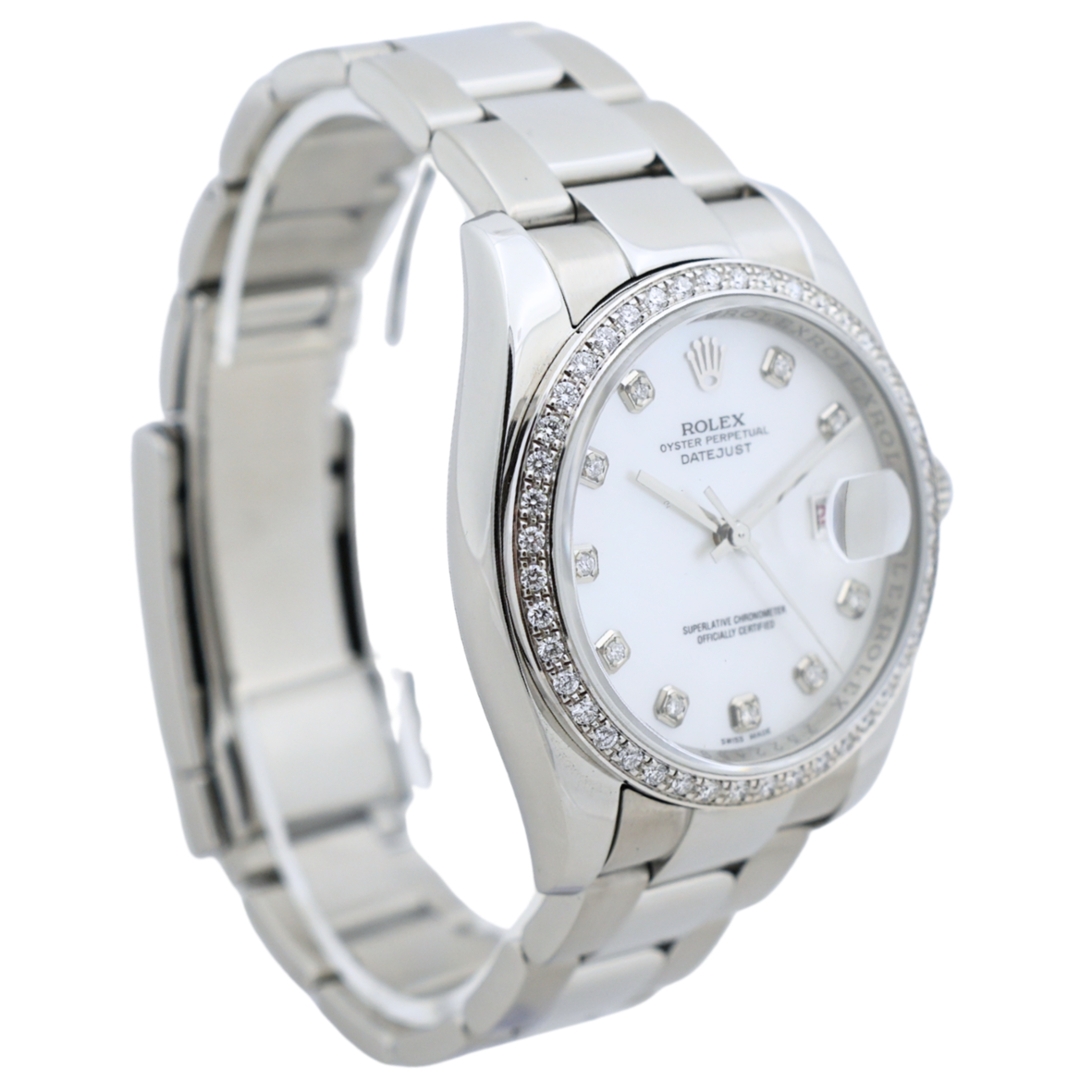 The watch features an aftermarket mother-of-pearl diamond dial, adding iridescent depth and elevated brilliance. Surrounding the dial is an aftermarket diamond-set bezel, enhancing visual presence and creating a more statement-led aesthetic against the stainless steel case.