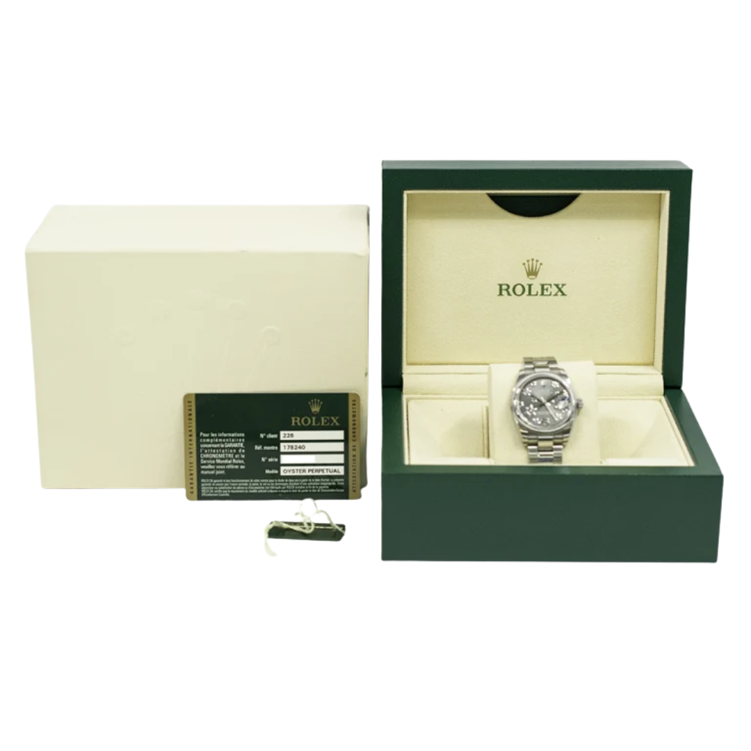 A Rolex Datejust 31 reference 178240 in stainless steel, featuring the distinctive grey floral dial. The embossed floral motif gives this model a more contemporary and expressive character, while the applied silver numerals and baton markers maintain the unmistakable Datejust identity. The smooth steel bezel keeps the overall aesthetic clean and modern.