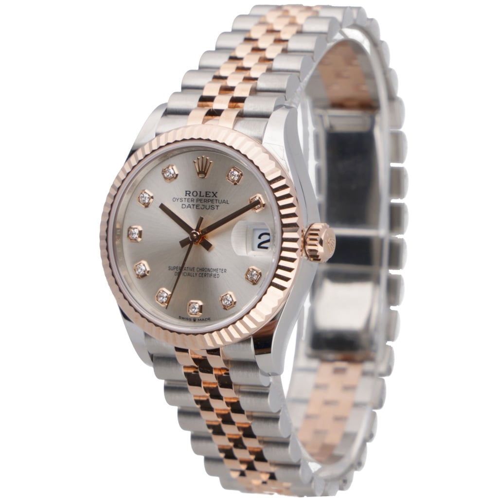 A Rolex Datejust 31 reference 278271 in Oystersteel and 18ct Everose gold, presented boxed and certified with its original full set of Rolex paperwork. The 31mm case is fitted with the signature Everose fluted bezel and mounted on the Jubilee bracelet, offering a refined balance between classic elegance and everyday versatility.