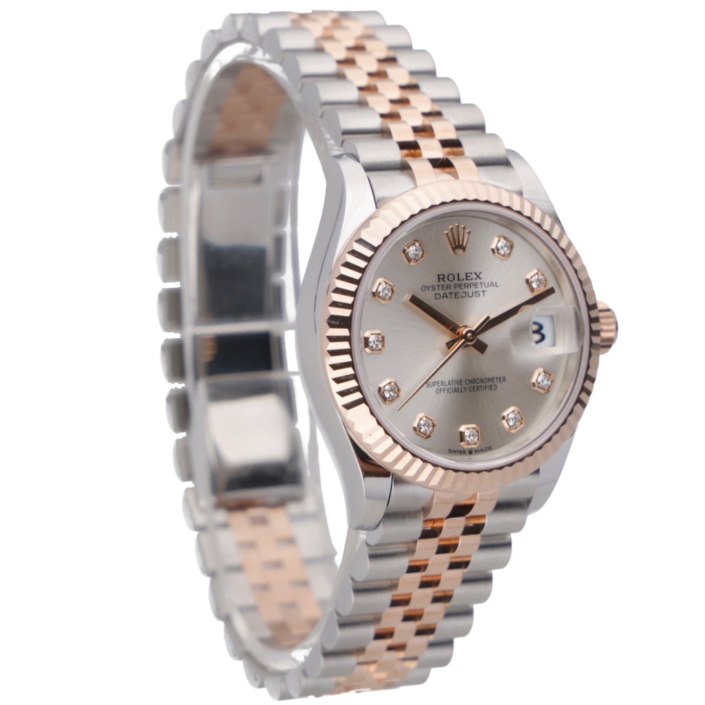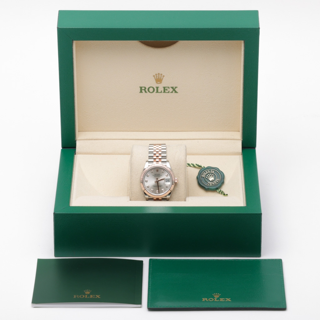 The dial shown features a sunburst finish and is set with original Rolex factory diamond hour markers in Everose surrounds, creating a cohesive, warm aesthetic that pairs seamlessly with the bi-metal construction. The proportions of the 31mm case continue to prove highly popular, offering presence without excess. Powering the watch is the Rolex Calibre 2236 automatic movement, featuring a Syloxi silicon hairspring and Superlative Chronometer certification for precision and reliability.