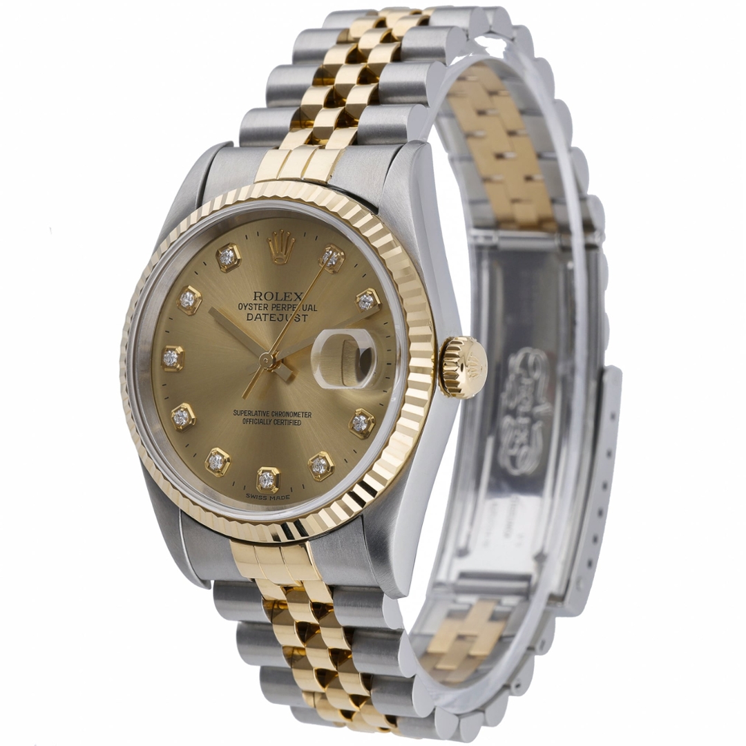 A Rolex Datejust reference 16233 from 1998 is a classic example of the brand’s enduring two-tone design. The 36mm Oyster case pairs stainless steel with an 18ct yellow gold fluted bezel, complemented by the matching bi-metal Jubilee bracelet. A warm champagne dial with diamond hour markers completes the instantly recognisable Datejust aesthetic.